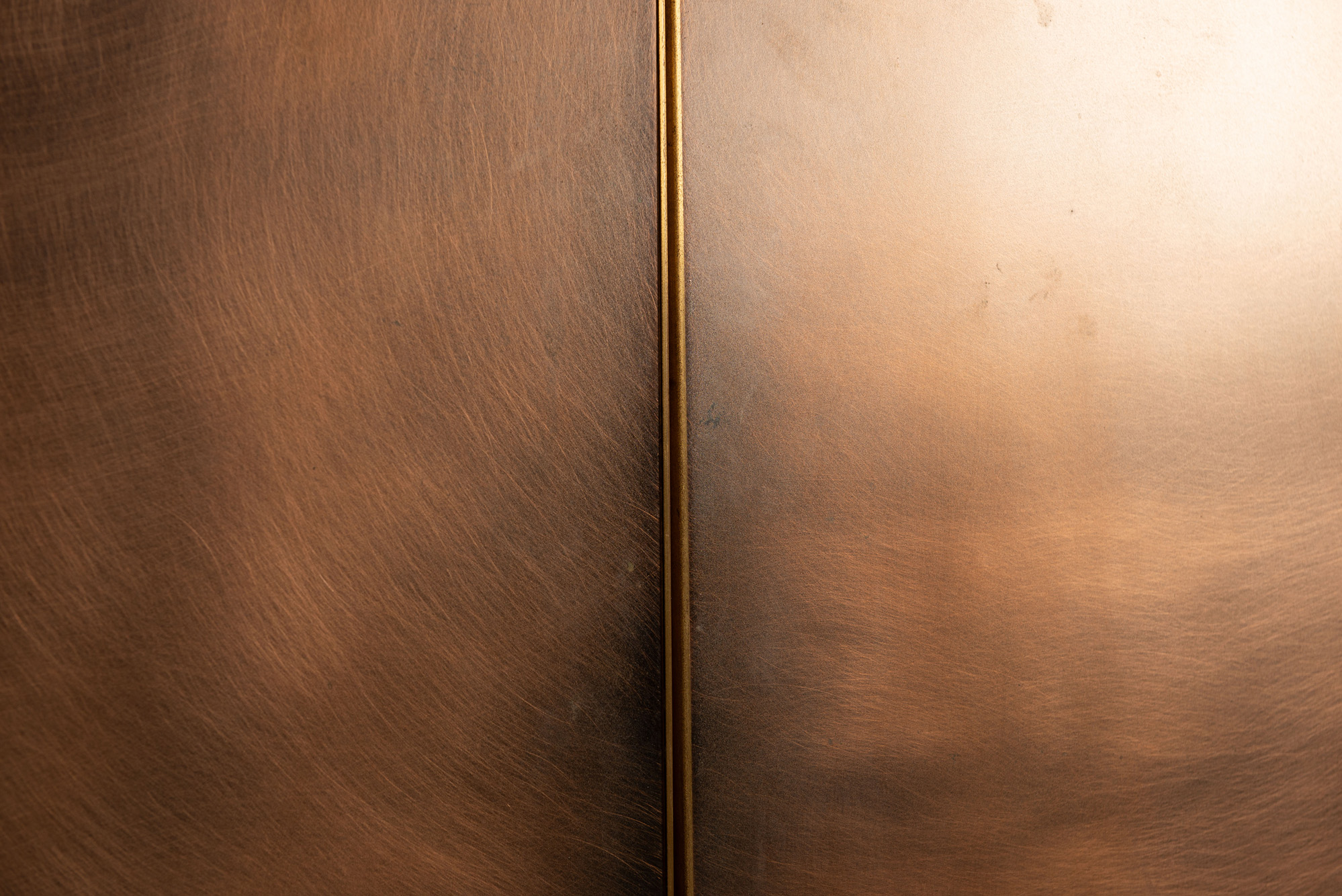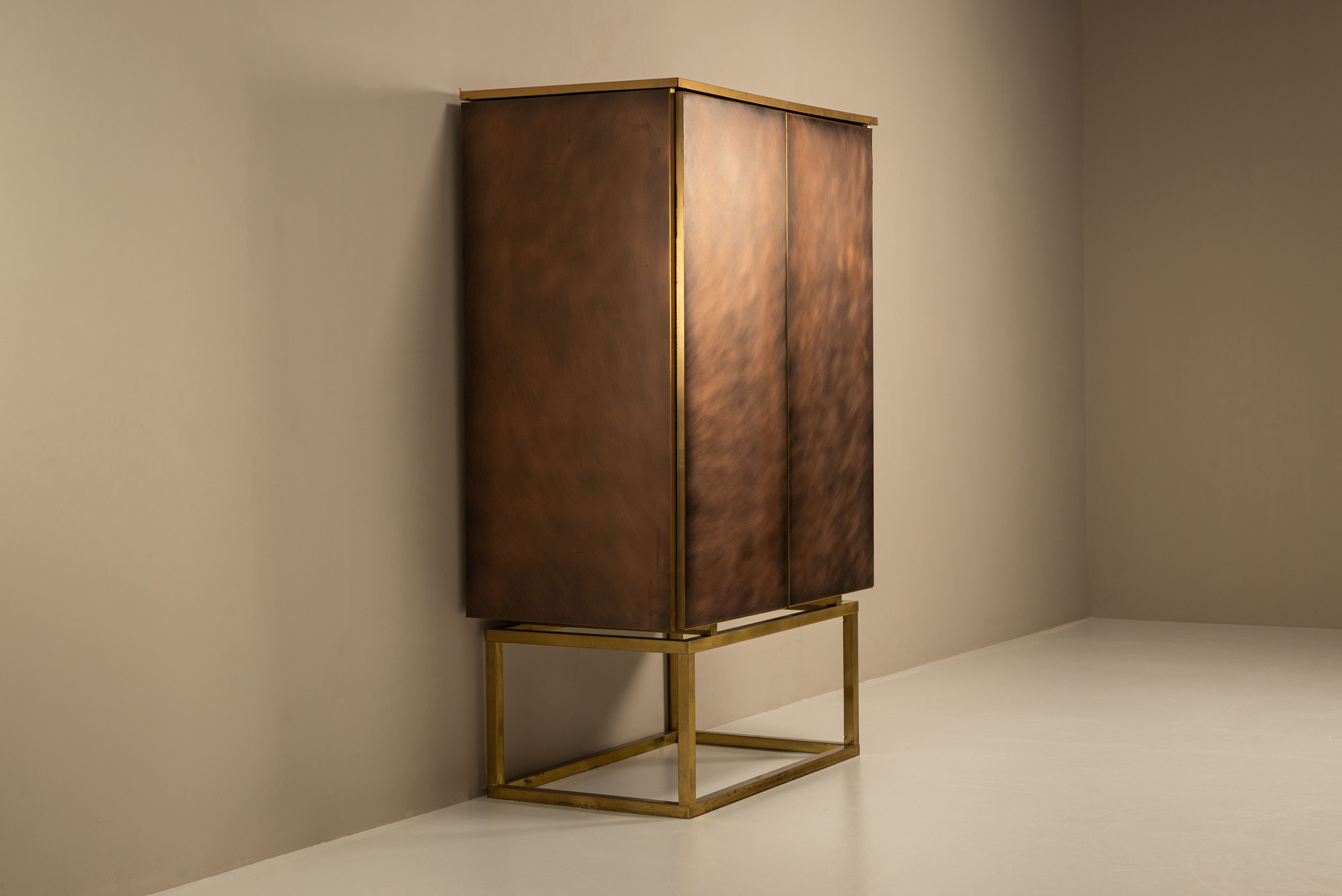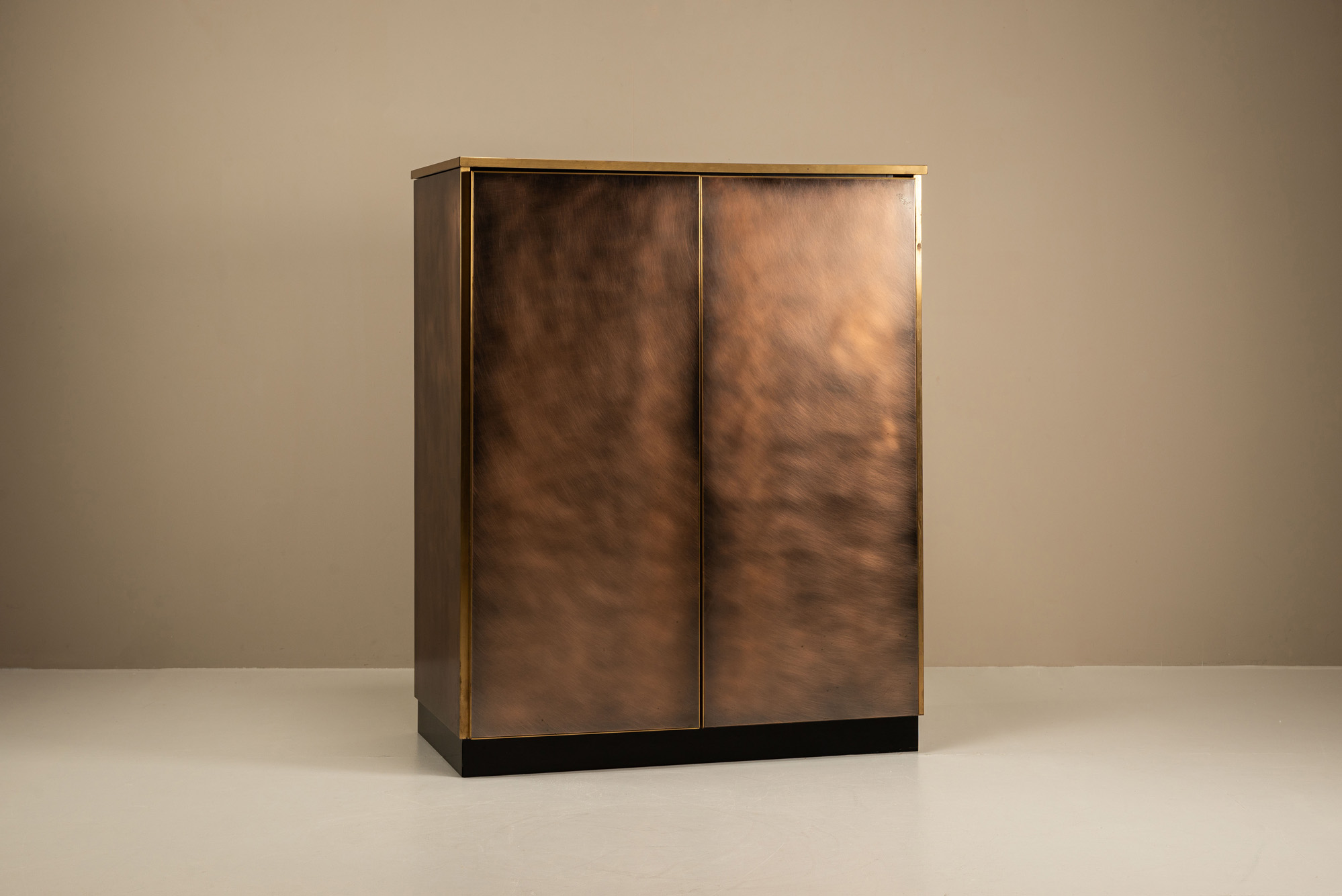 The cabinet’s surface is finished in a brushed bronze effect, with circular motion lines catching the light and animating the otherwise restrained geometry. The doors are framed by slim brass edging, maintaining the firm graphic lines typical of Belgochrom’s production. Inside, the matte black interior offers adjustable shelving, balancing practicality with clean minimalism.