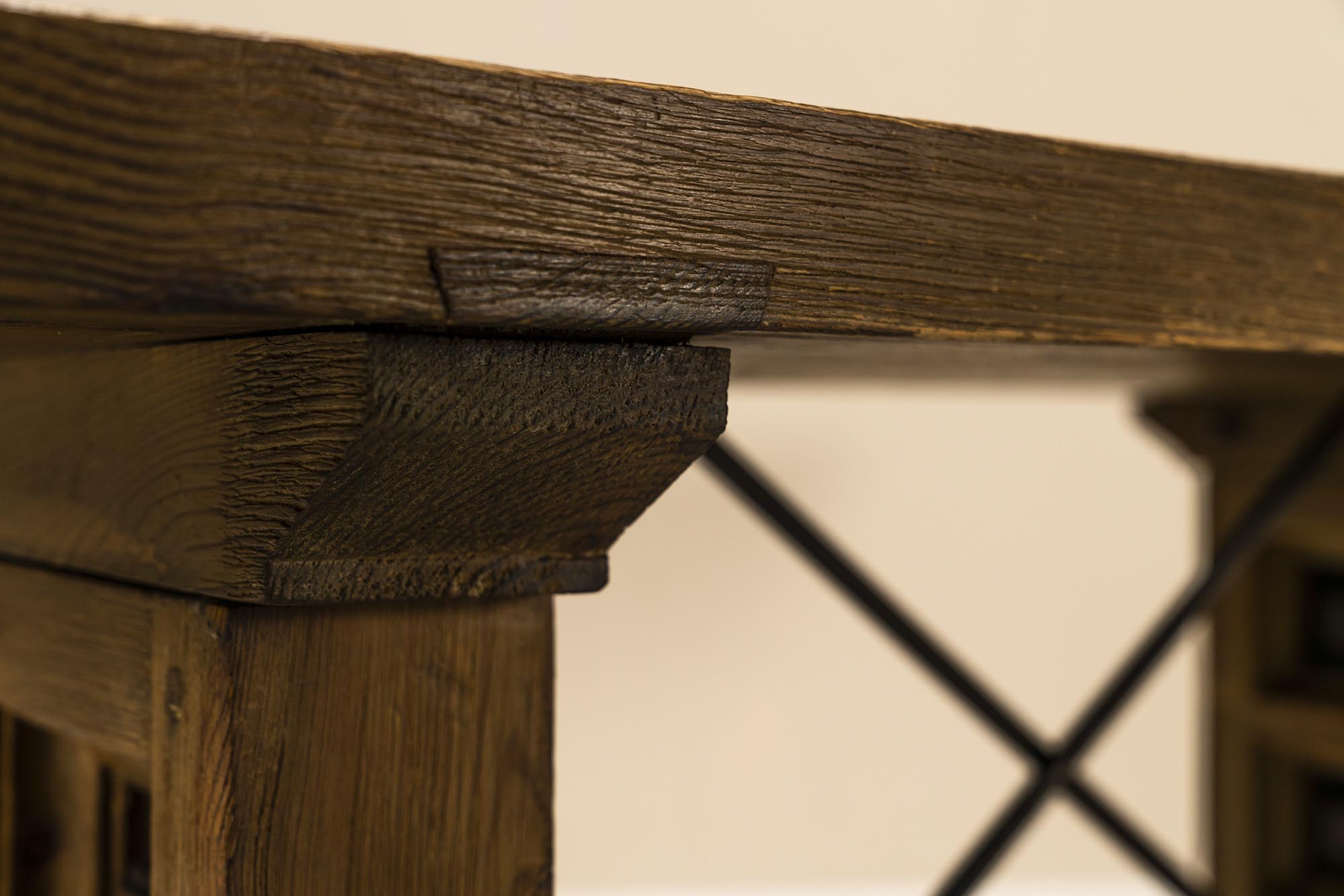 This table is also completely in the recognizable but special "Biosca" style. Two prominent legs are made of solid pine and are decorated on both sides with a geometric carving. This could be a reference to the strong Moorish influences in the south of the Iberian Peninsula where even more complex mosaics adorned the buildings.Incidentally, we see similar decorations in Spanish furniture and for instance doors from the seventeenth century. The wrought iron bars that reinforce the table in a crosswise manner can also be seen in tables from the above period. These are also attached to the outside of the legs with a beautiful rosette.This table initially communicates a robustness through the somewhat rough table top, but is mainly characterized by refinement when we look more closely at the base. So more than meets the eye and Biosca above all has mainly succeeded in summarizing an important part of Spanish aesthetic history in a piece of furniture.