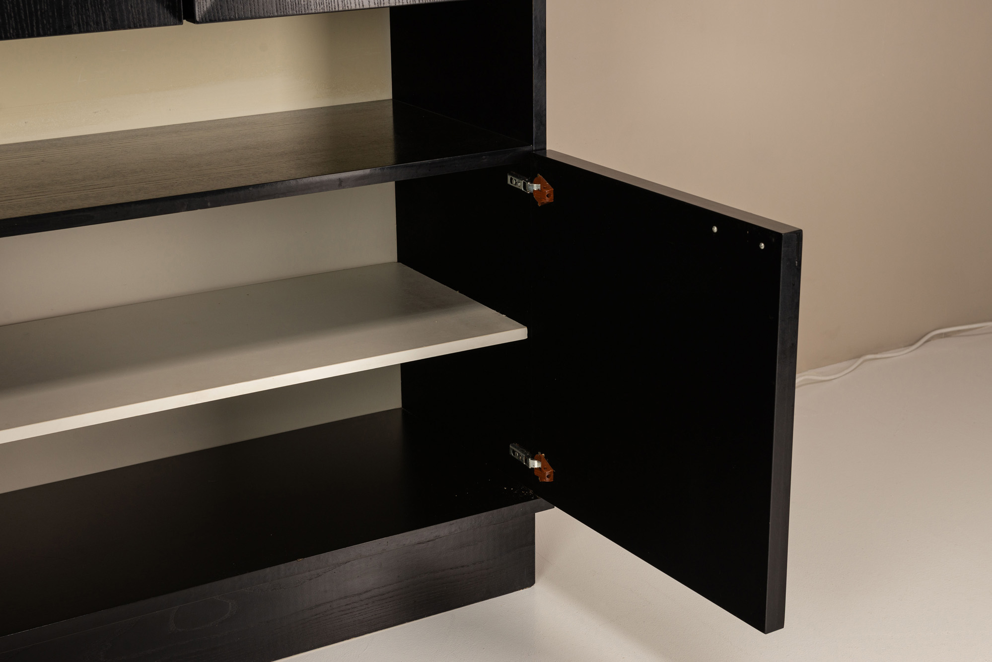 The four carved doors each feature a pronounced circular motif, contrasting against the cabinet’s otherwise angular structure. This repetition of bold geometries recalls the design vocabulary of Defour’s Torino pieces, where rhythmic surface pattern and robust materials define the aesthetic. Carved in dark-stained oak, the façade creates a graphic interplay of shadow and texture. An open central compartment divides the cabinet horizontally, offering both display and practical access.