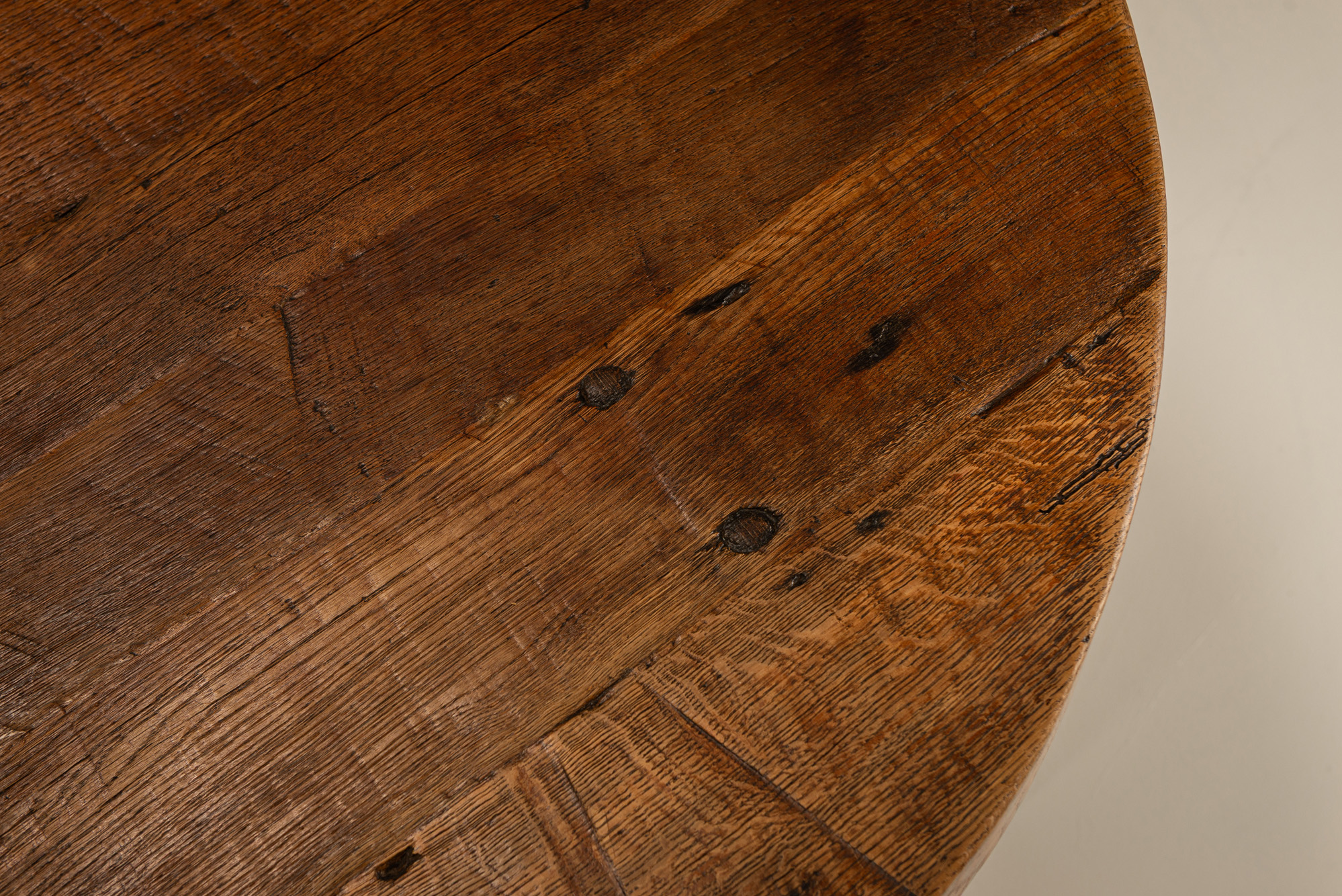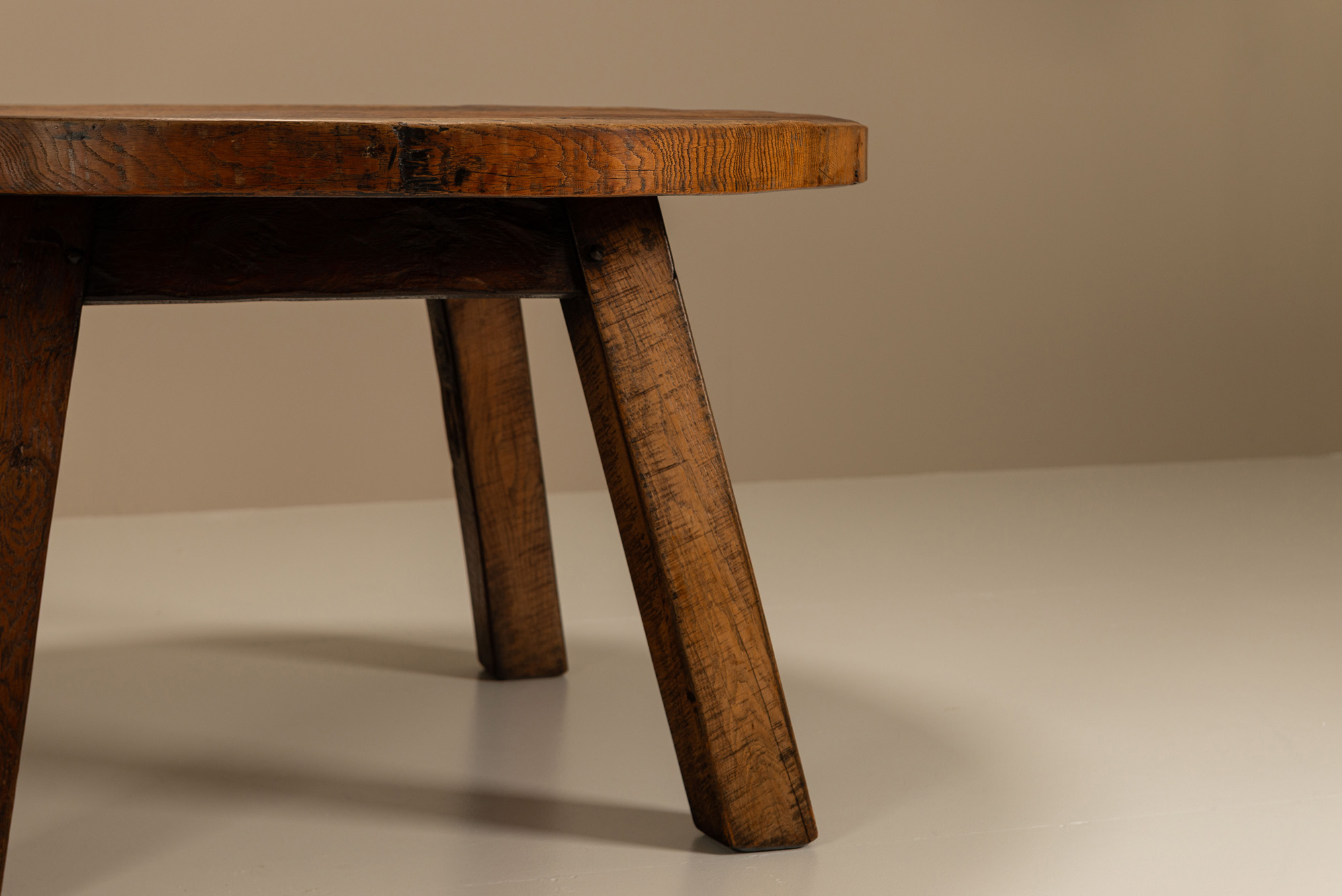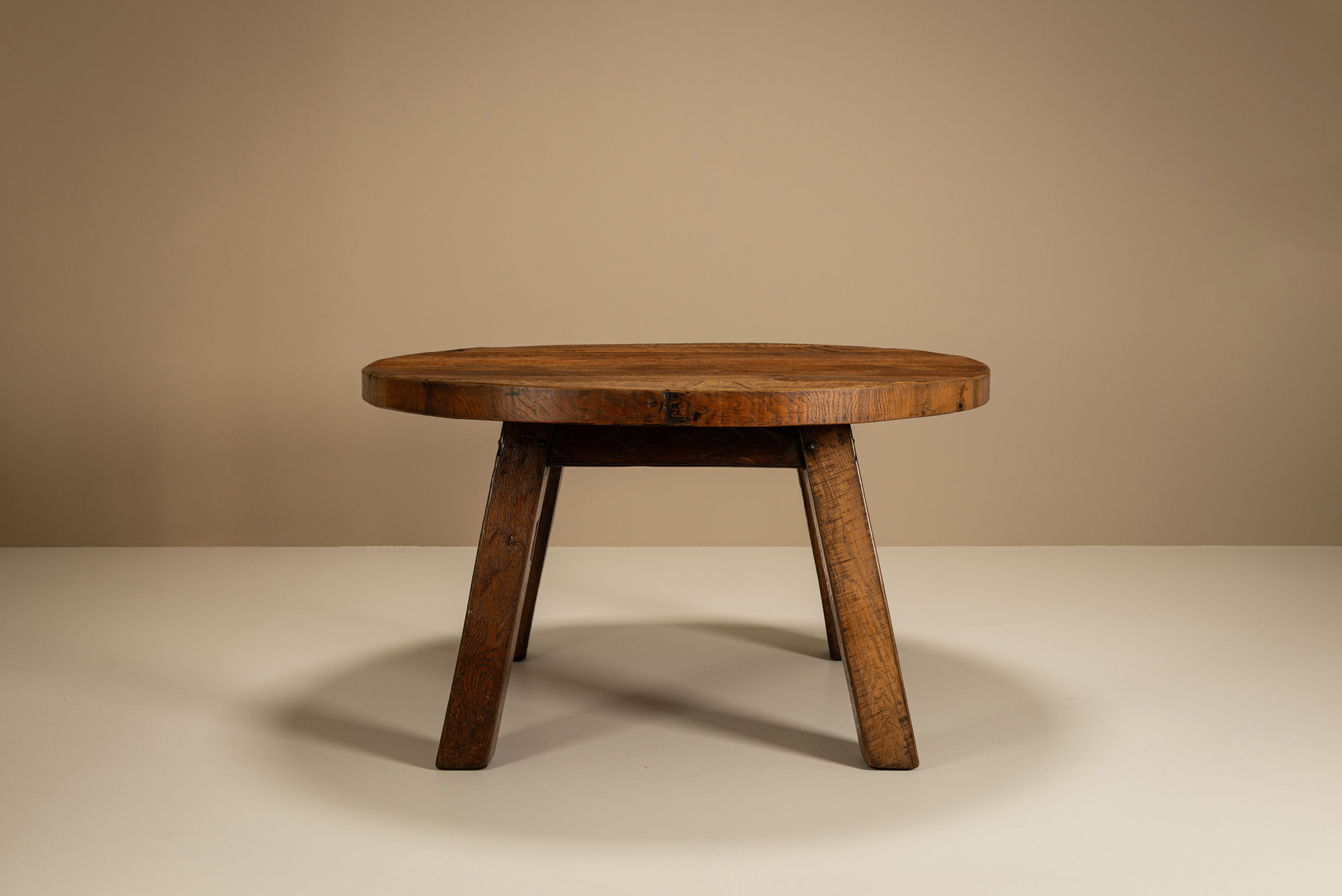 Crafted in France in the 1950s, the table reflects a utilitarian ethos characteristic of post-war Brutalism. The thick, circular tabletop is hewn from solid oak, revealing the expressive grain and natural imperfections of the wood. A deep, warm patina has developed across its surface, the result of decades of use and wear. Four broad, slanted legs form a square stance beneath the top, lending a subtle geometry to the otherwise organic form. The angle of the legs offers both visual tension and physical sturdiness, recalling the carpentry traditions of rural Europe. Joints and construction are deliberately left exposed, celebrating the labour that went into its making. The table feels almost architectural; a piece built not to impress but to endure.