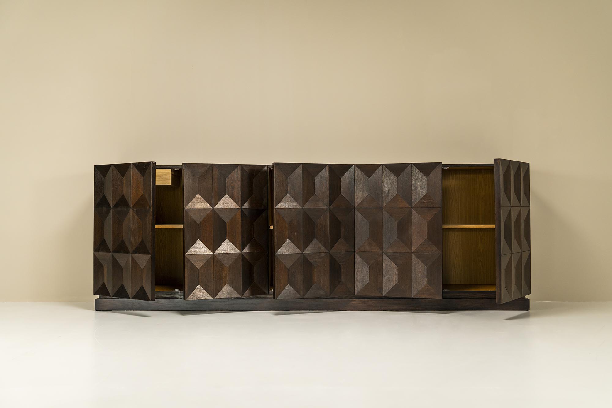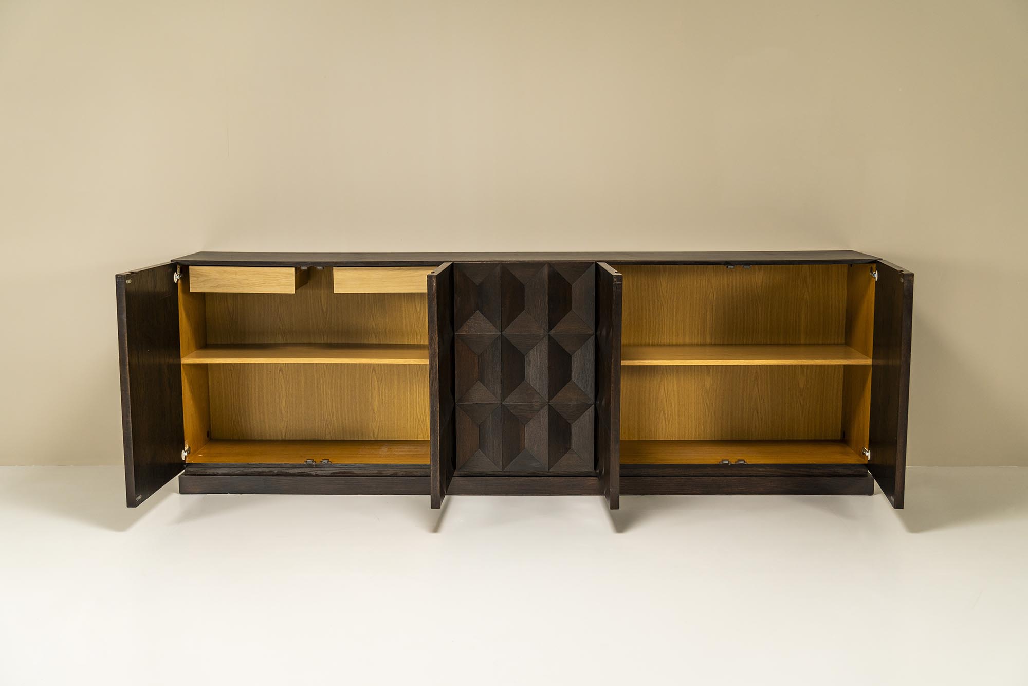 The front is defined by five sculpted doors, each carved with a dynamic diamond relief pattern that gives the piece a sense of depth and motion. These angular motifs, typical of Brutalist visual language, suggest both structure and spontaneity. Subtle magnets integrated into the design allow each door to shut flush, preserving the integrity of the bold facade. Behind the left panel, two modest drawers provide easy storage for cutlery, documents, or other smaller pieces. The remaining interior is structured by three horizontal shelves, creating six compartments in total, offering clarity and flexibility in storage.