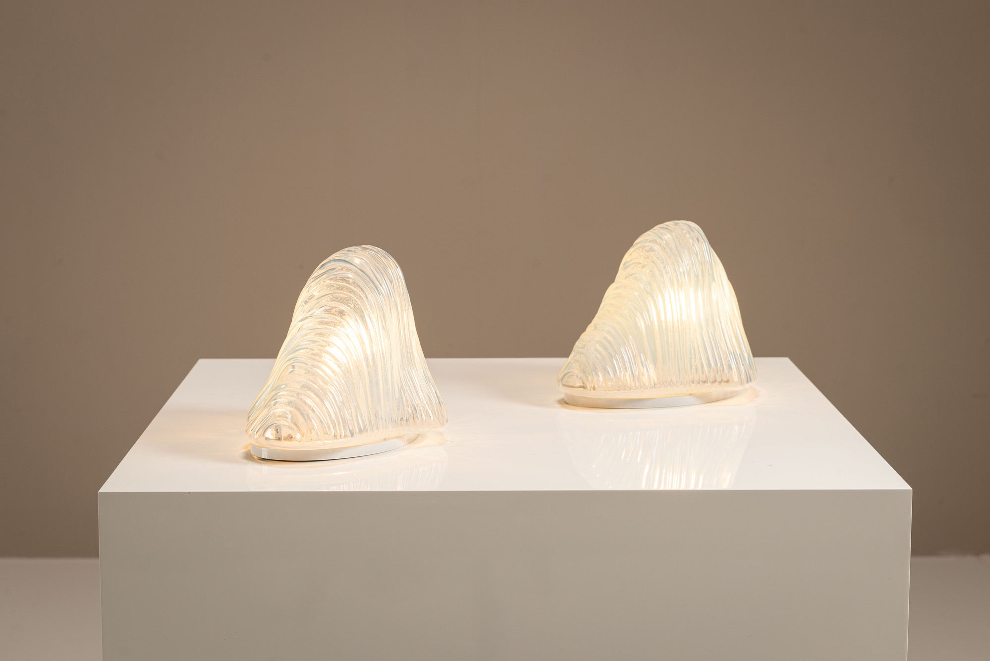 Each lamp features a layered, ribbed glass shade shaped to evoke the contours of a natural ice formation. The surface plays with light both when illuminated and when switched off, giving the glass a translucent quality with opalescent undertones. Made in Murano during the 1970s, these works were produced by the renowned AV Mazzega glassworks, known for its ability to push the boundaries of Murano techniques.