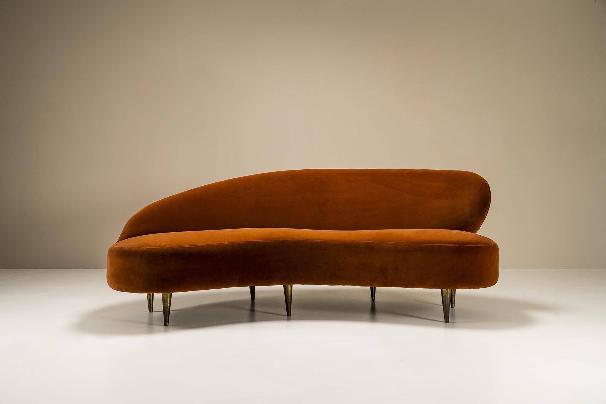 Curved sofa in velours attributed to Federico Munari.Wonderful organically formed with a challenging character and the look that is so unmistakable for the grandeur of Italy in the field of interior design in the fifties. This curved sofa is a good example of this and is also characterized by soft round shapes with beautiful ascending lines.