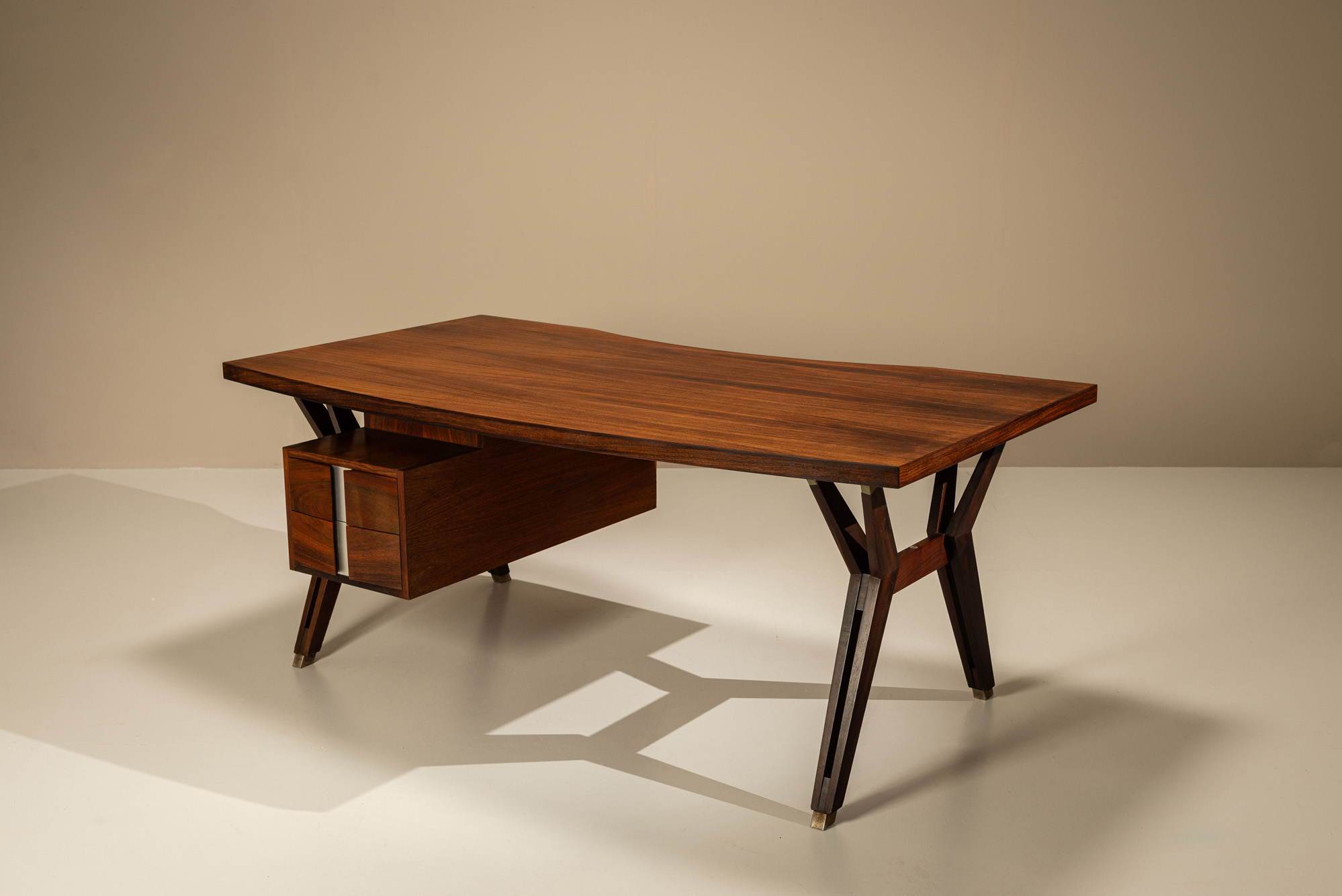 What immediately stands out about this desk are the black scissor-shaped legs that contrast sharply with the peculiar body part. We often see these heavily stylized legs in Italian design from the 1950s. For example, at the end of that era and the early 1960s, Mangiarotti and Morassutti used a modern interpretation of scissors as legs on a complete line of furniture made by Mascheroni, among others.