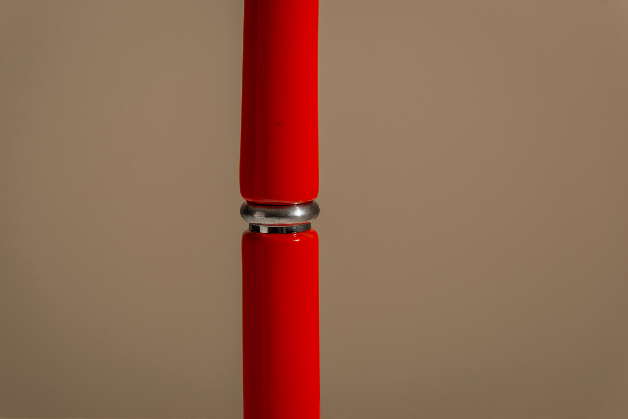 Designed in 1971 for Guzzini, the “Lampione” lamp is notable for its fluid, continuous form in ABS plastic, culminating in an arched head that houses the light source. The integrated design eliminates hard angles, echoing both Pop and Space Age sensibilities. A polished chrome ring at the centre of the stem acts as a tactile switch: turning the ring controls the light on, off, and dimming, offering a seamless functional element within the form.