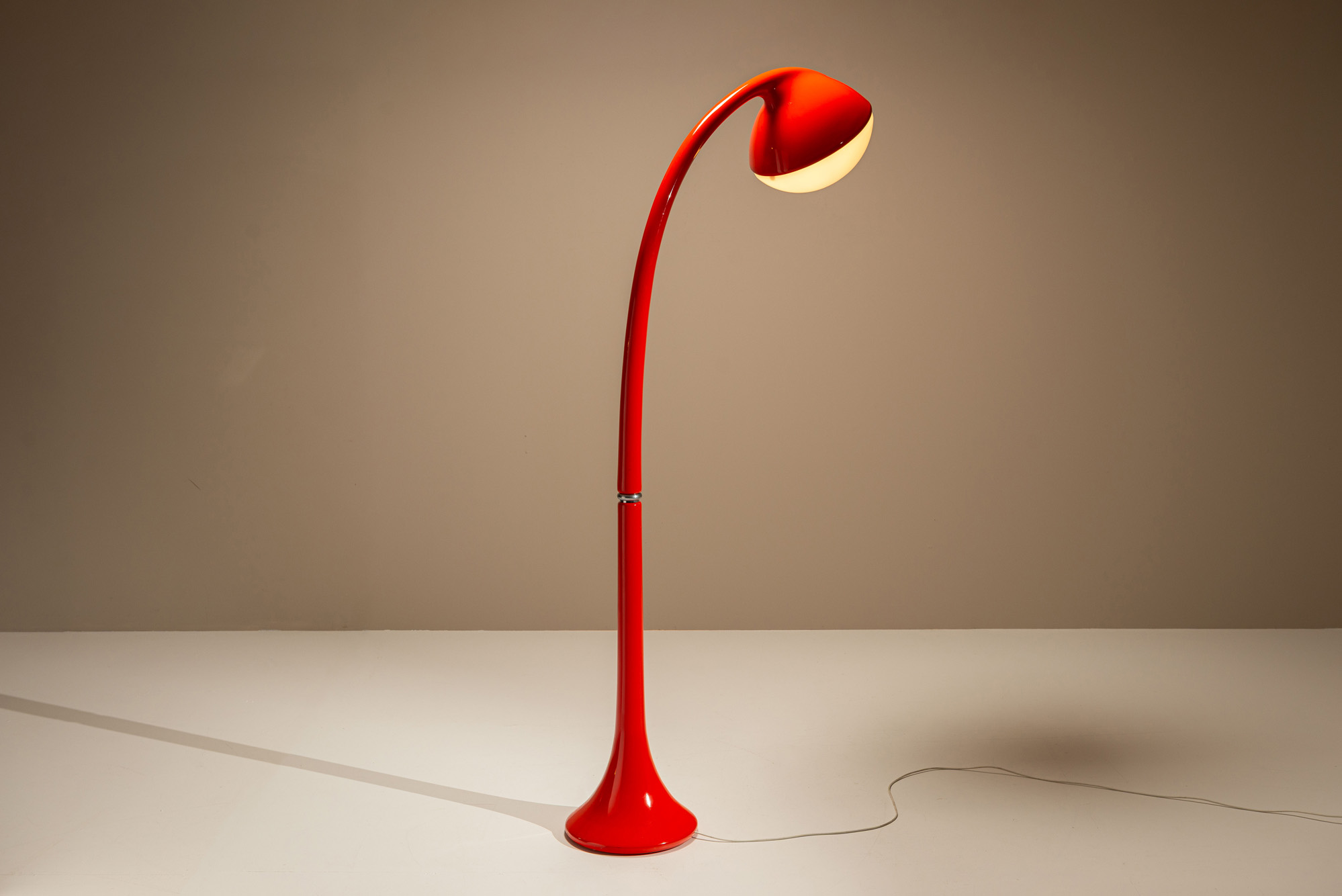 The lamp’s weighted trumpet-shaped base ensures stability, while the glossy orange-red finish accentuates its dynamic contours. Its upward-reaching curve is both functional and expressive, creating directed illumination ideal for reading or accent lighting in interiors that favour sculptural modernism.