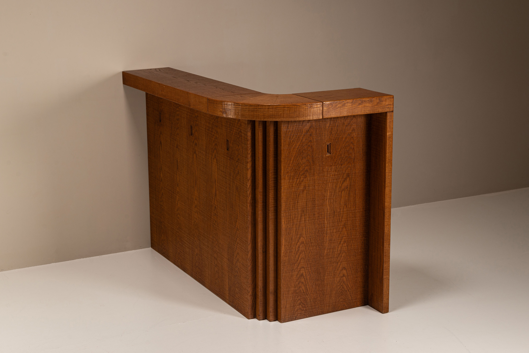 Constructed in Slavonian oak, the bar's presence is defined by its geometric rhythm and tactile depth. The façade features vertical carved channels that modulate the surface in a language reminiscent of architectural reliefs, an approach central to Rivadossi’s work since the 1970s. These not only emphasise the volume but also engage with light, casting gentle shadows that shift throughout the day.