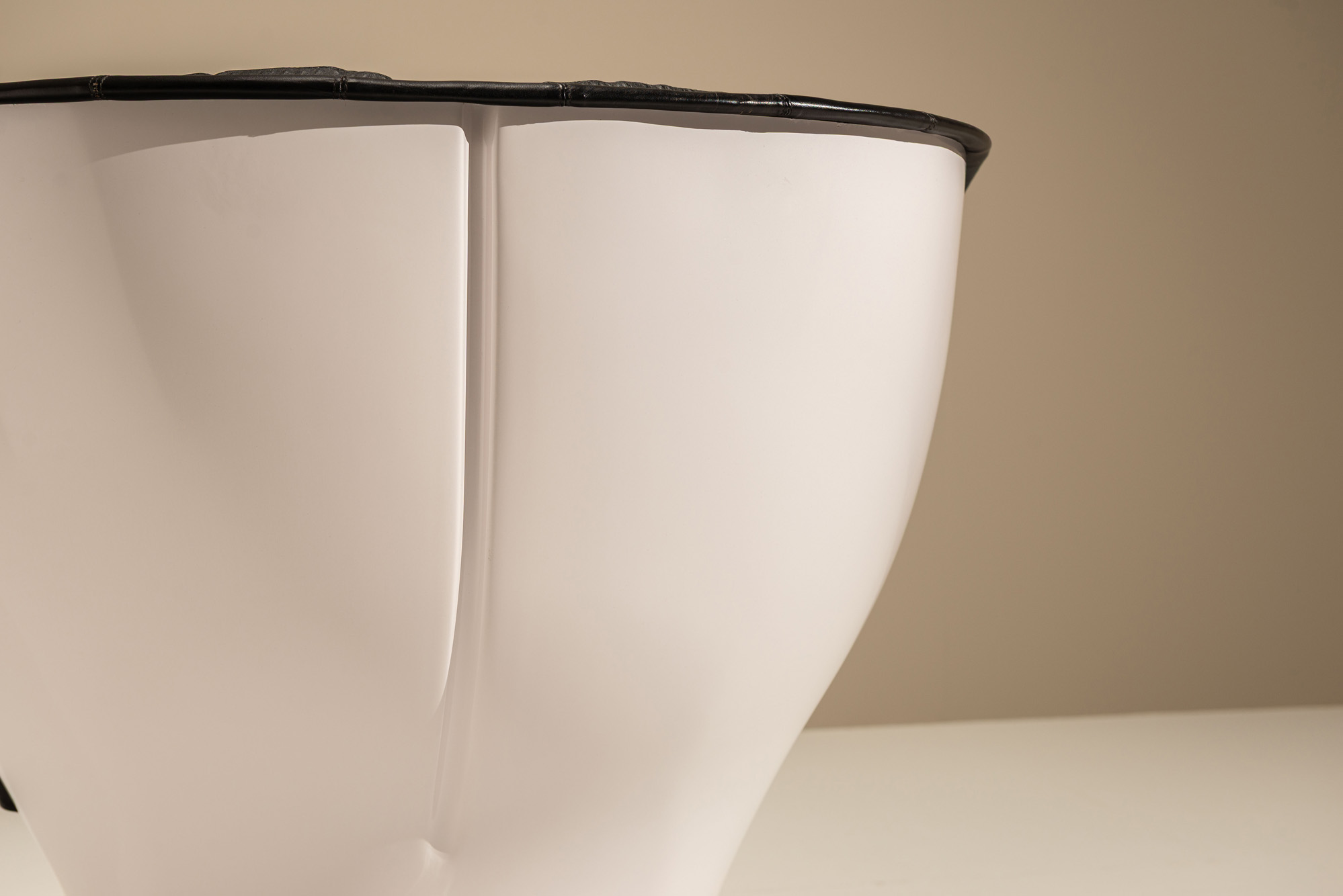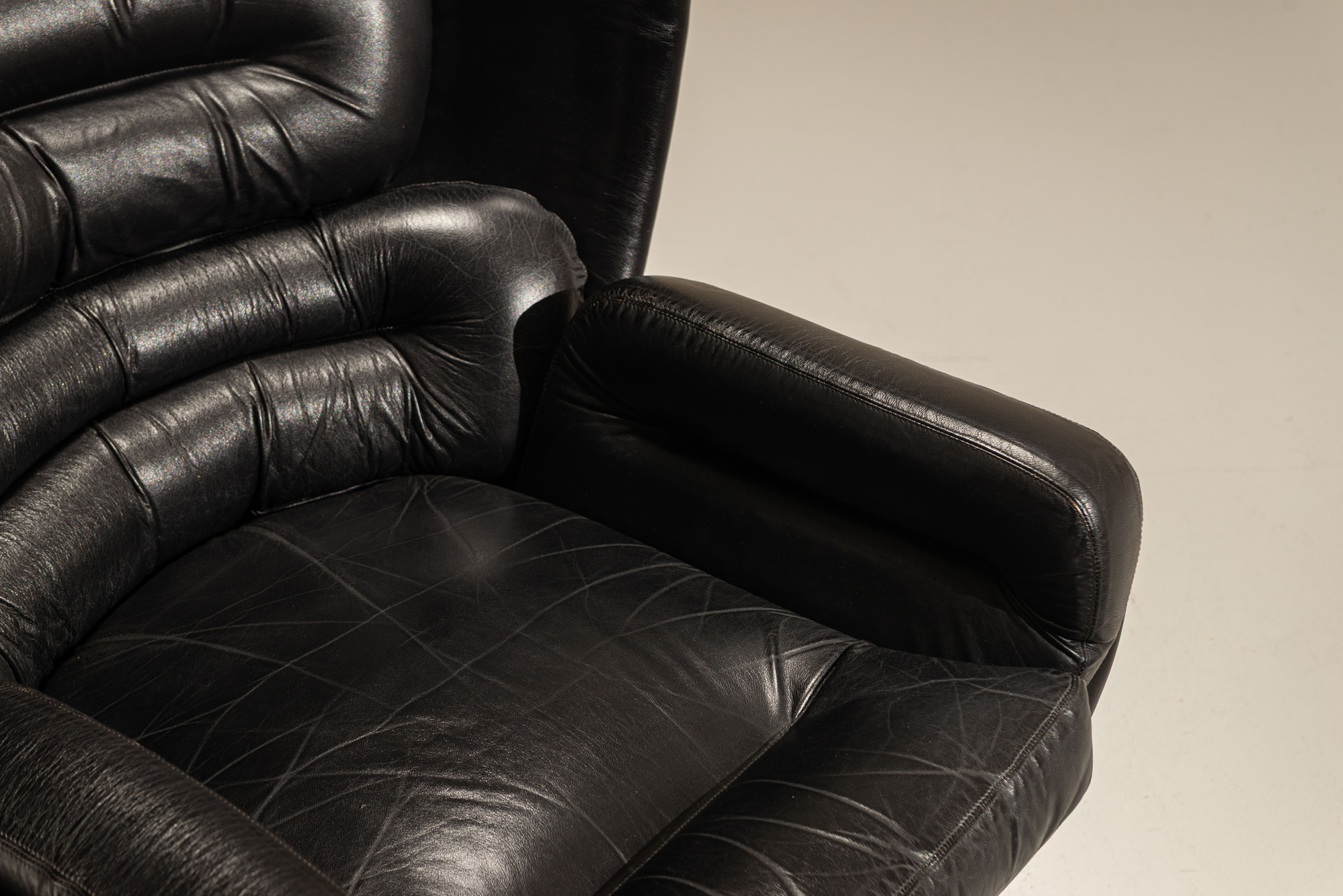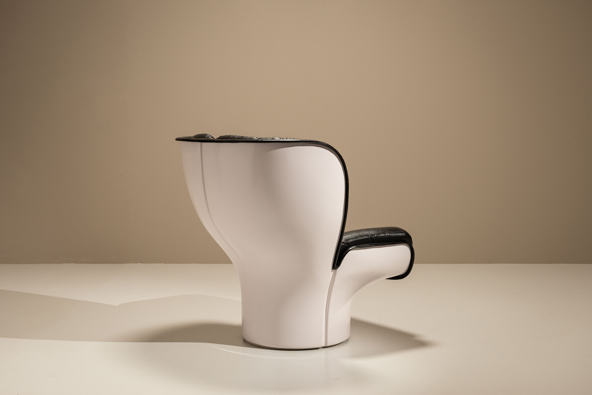 This example is an early production of the Elda, featuring a glossy white fibreglass shell combined with original black leather upholstery. The chair’s wide, winged back is made from seven deep-cushioned, horizontal pads, creating an enveloping seat that cocoons the sitter. A swivel base offers movement, while the fibreglass body gives the chair its characteristic bold profile. At the time, Colombo named the design after his wife, Elda, and intended it to offer both comfort and an experience, much like sitting in a cockpit.
