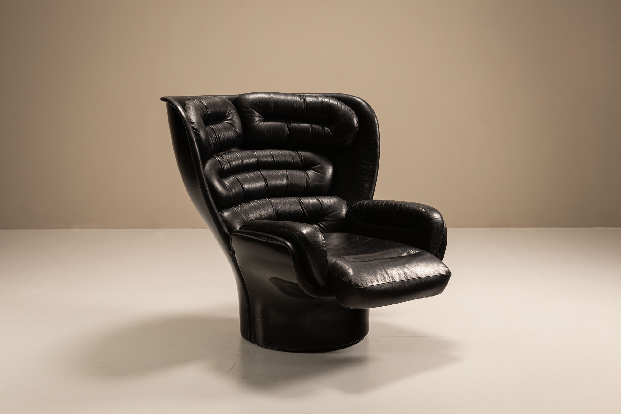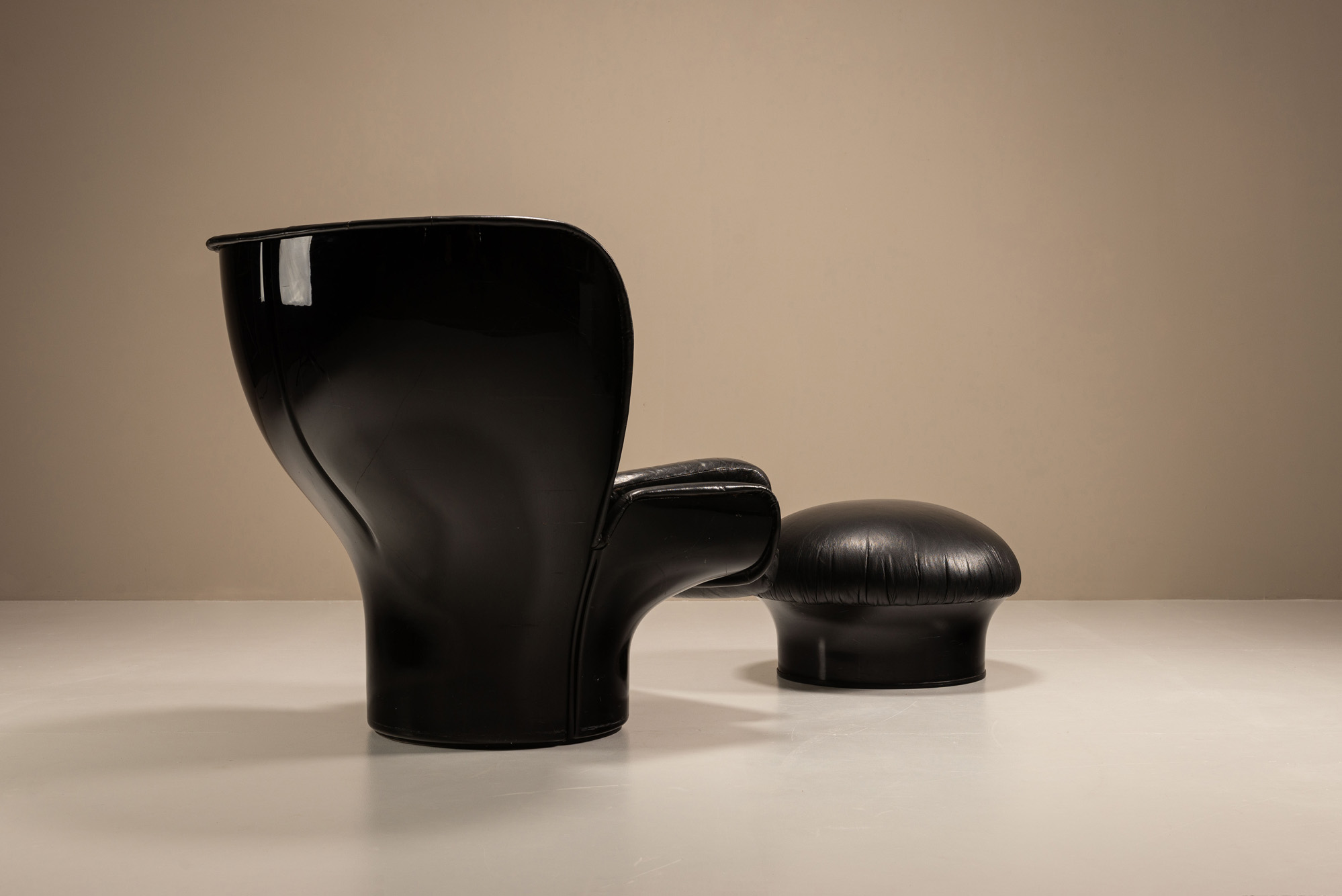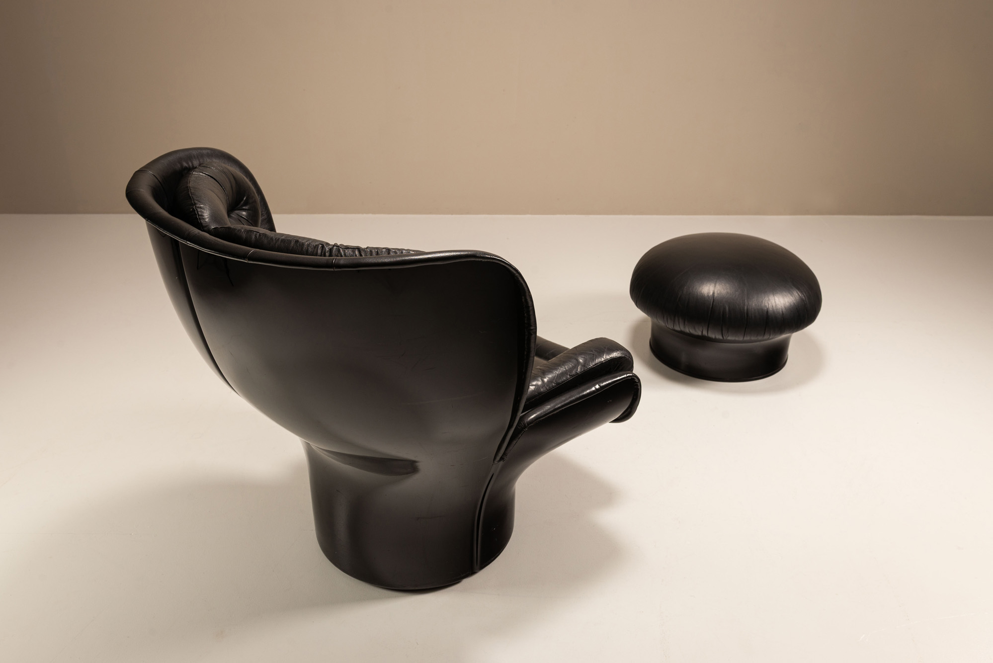 A sculptural statement in black leather and fibreglass; this original Joe Colombo Elda chair is here paired with a rare Mario Brunu-designed pouf. Both produced by Comfort, Italy, in the late 1960s to early 1970s.