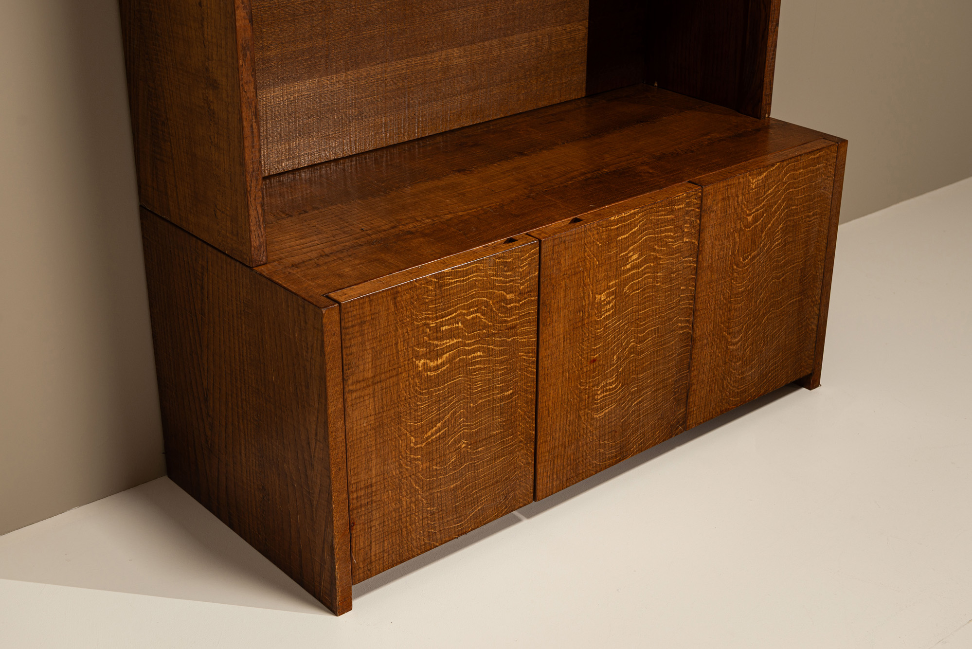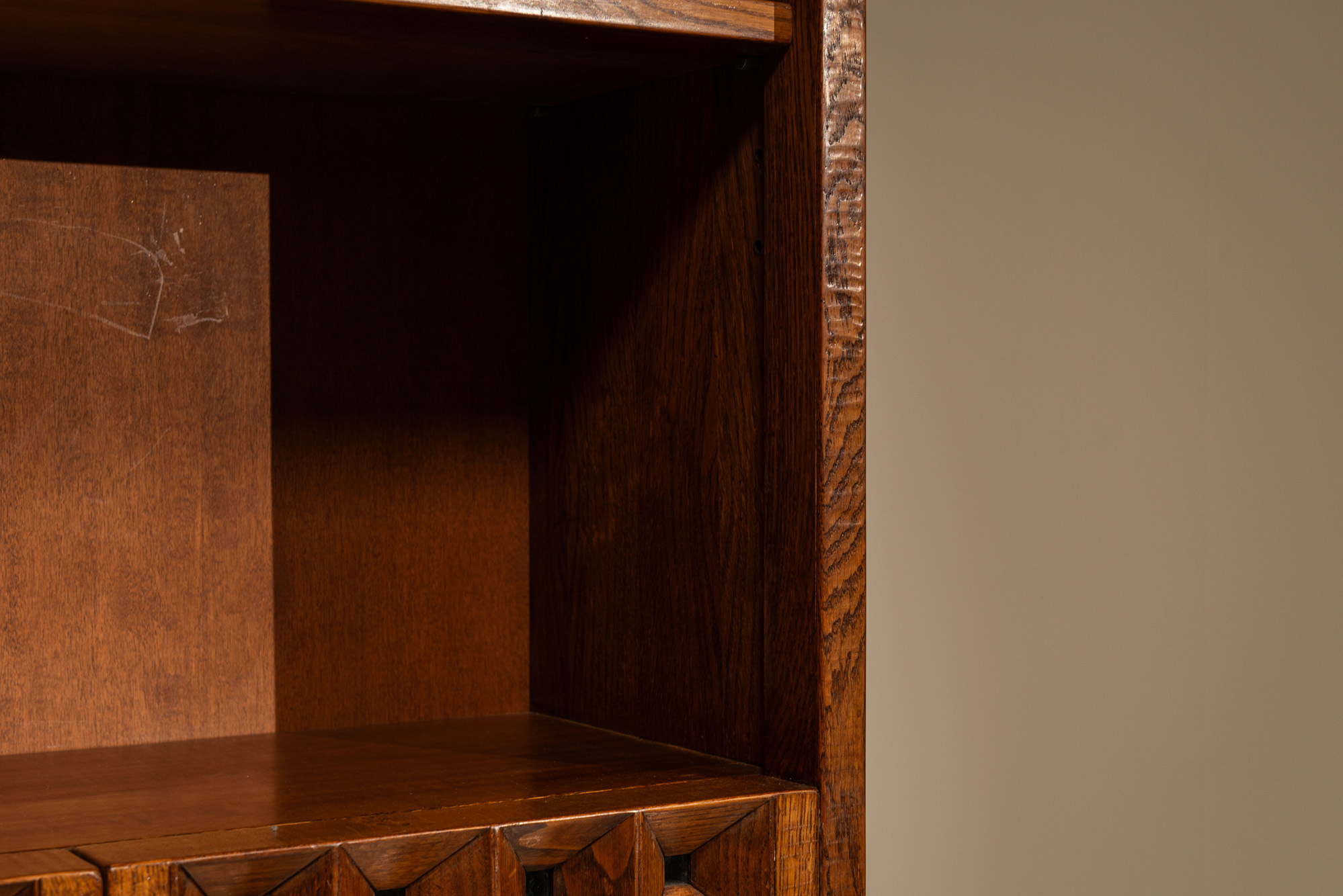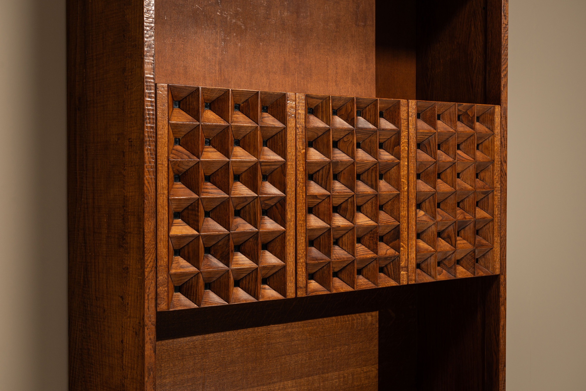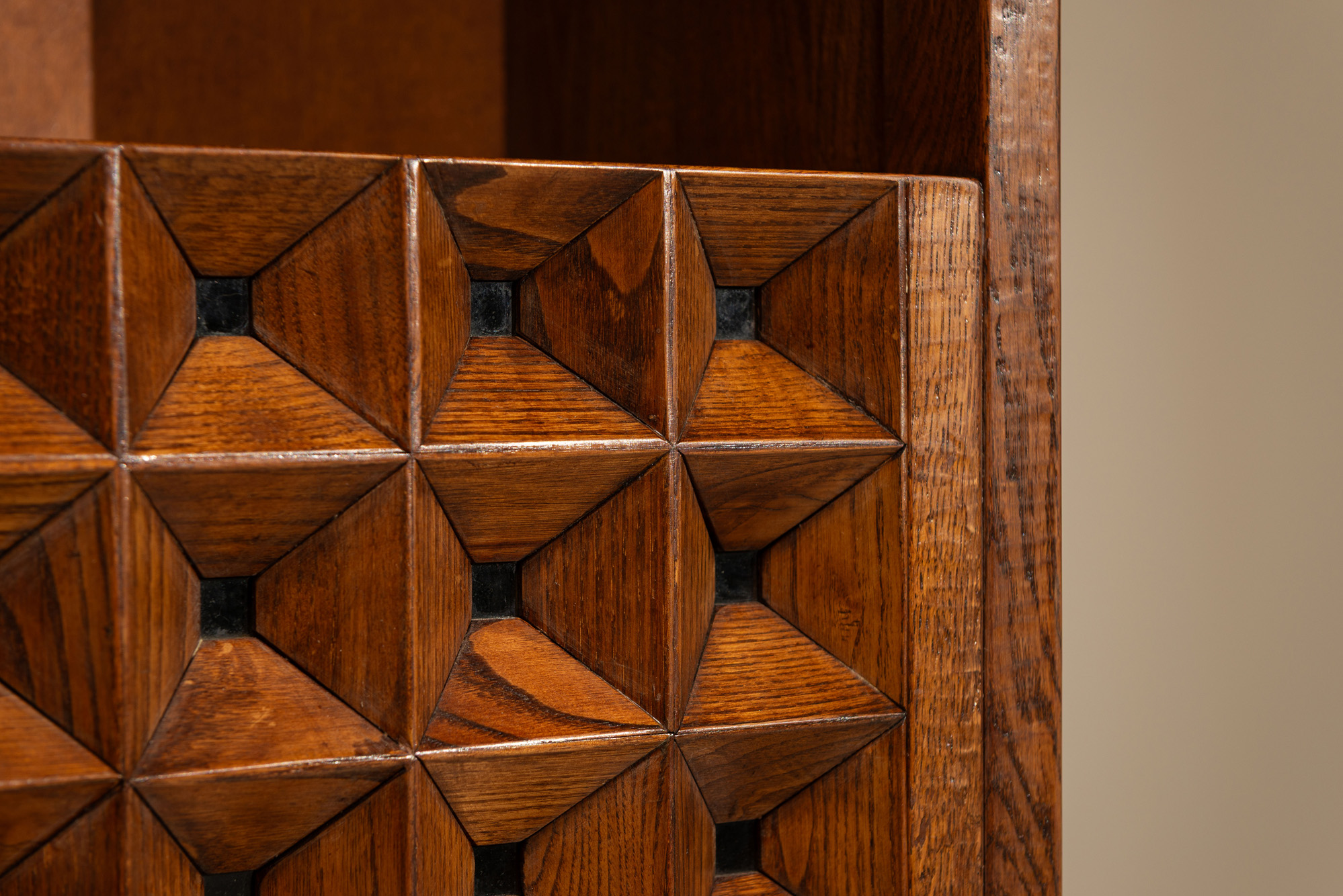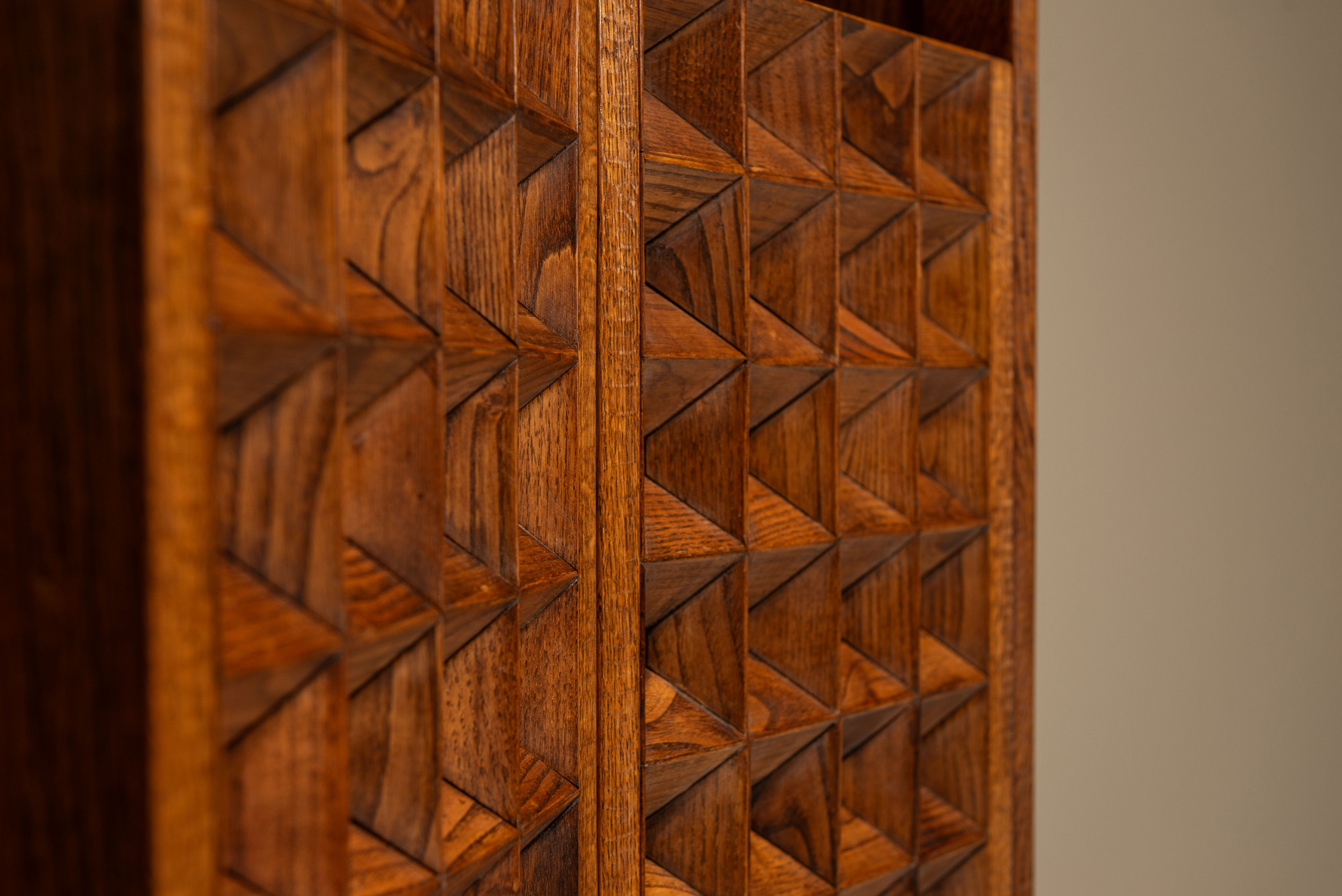 Rivadossi's approach to furniture is closer to architecture than carpentry. This tall cabinet is divided into three main segments: open shelves at the top, a central section of intricately carved doors, and a plinth-like lower section with smooth panels. The most distinctive element lies in the three upper doors. Each is adorned with a hand-carved geometric relief made of inward-pointing pyramidal forms individually chiselled and symmetrically aligned to create a bold tactile surface. This sculptural articulation is characteristic of Rivadossi’s workshop, where every detail is shaped to engage both the eye and hand. Inside, a grid of small internal compartments and shelves reveals a thoughtful layout for practical storage. The lower unit follows a quieter visual language, with integrated finger pulls and a plain oak grain that offers a grounded counterpoint to the ornate middle tier.