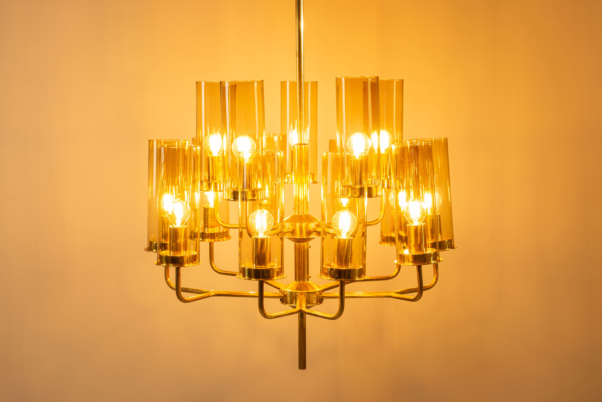 This elegant chandelier was designed in the 1960s by the Swedish interior and furniture designer Hans Agne Jakobsson. His philosophy was to create a soft glowing light that should absolutely not dazzle. In this beautiful design, which consists of two 'layers', we see that fifteen cylinders with a height of twenty-two centimetres have been placed over the light sources. These cylinders are made of slightly smoked glass and provide that beautiful and elegant dimming of the light.