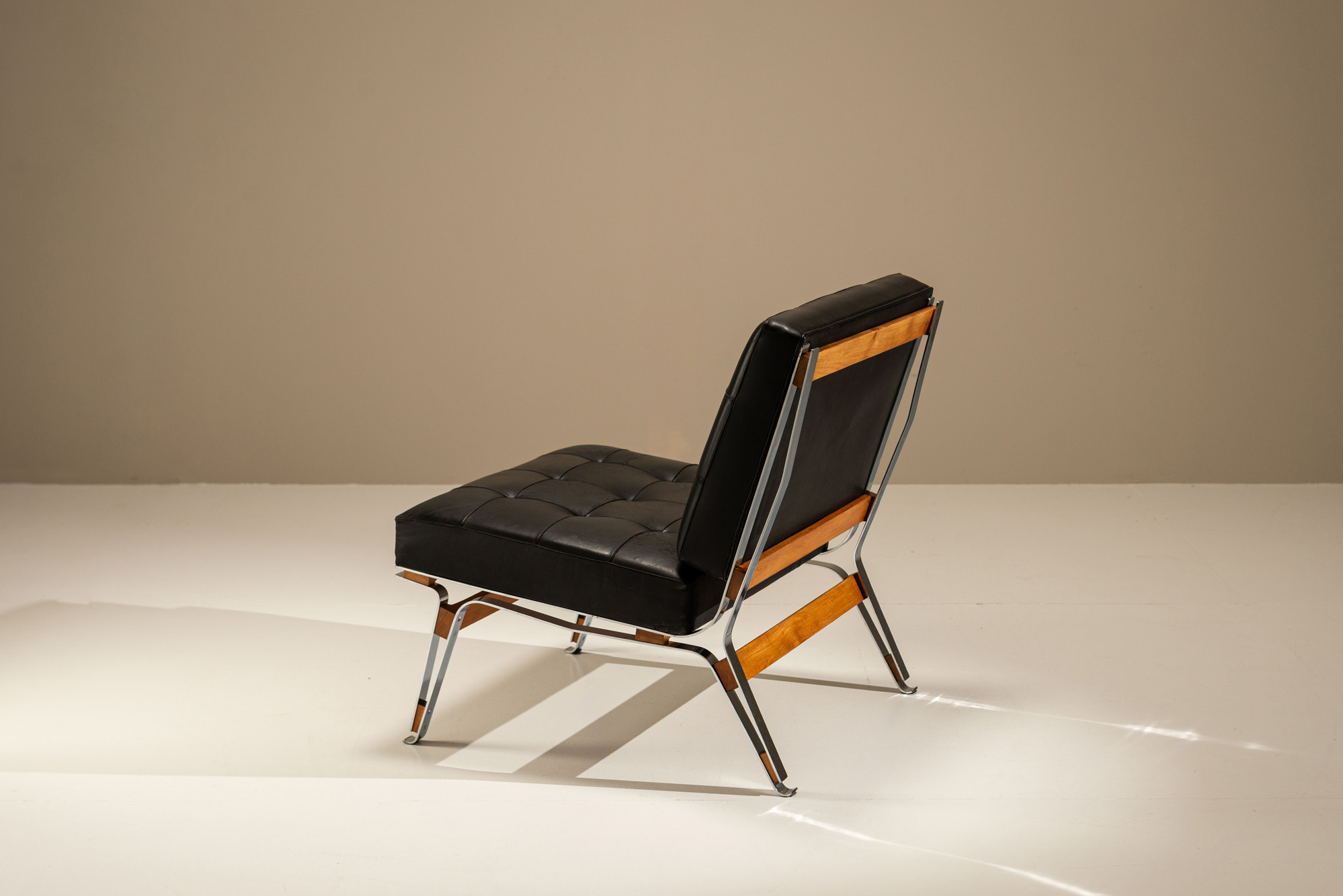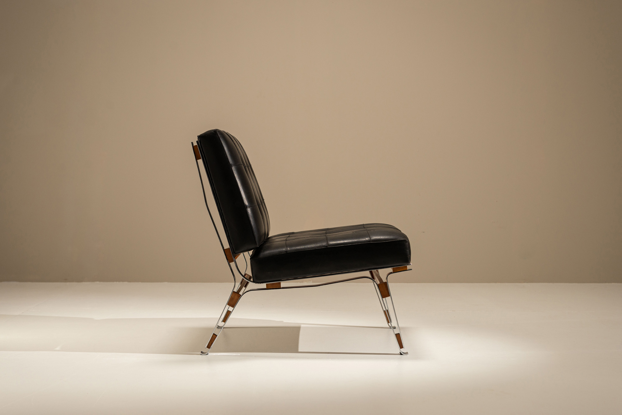 The frame combines aluminium with warm walnut details, creating a contrast that feels both practical and well judged. Slim metal legs support the seat, while the wooden elements soften the overall look. The seat and backrest are upholstered in the original black leather, which has been restored and treated. Its tufted surface adds a subtle pattern without overwhelming the design. Parisi often worked with lightness in mind, and that shows here in the open sides and slightly angled backrest. The chair feels stable but not heavy, making it easy to place in different settings, from a living room to a quieter reading space. Seen from the side, the lines remain simple and clear, with just enough detail to keep it interesting.