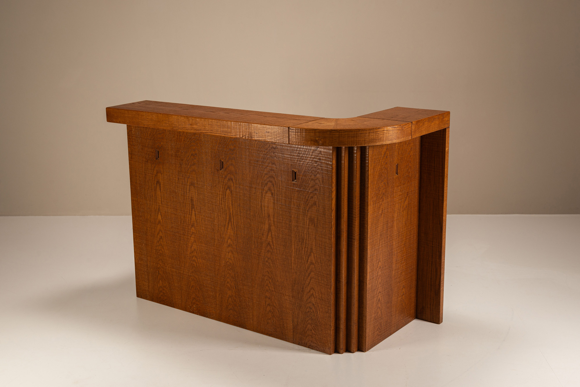 Italian ISA Bergamo chest of drawers in stained oak by Leonardo Fiori from the 1950s. A very pleasing chest of drawers was designed by the Italian architect Leonardo Fiori, a student of Le Corbusier. We see that Fiori has been influenced to some extent by the great master when we look at the proportions and the result thereof. The four drawers are in harmony with the top and bottom shelves and are decorated by elegant black lacquered metal handles. Next to the drawers is a seagrass door with a darker oak frame. In addition to the aesthetic aspect, the raised edge, or gallery, also has a functional purpose. You can quickly put something on it without it rolling or sliding off the commode. The storage area rests on a wooden frame and gives the whole an airiness. The construction has been made even more robust by the use of brass connectors that we see on the side of the chest of drawers and the frame. A combination of different shades of wood and sea grass results in an appearance of quality and tranquility. This beautiful chest of drawers is in good condition and the condition is fully consistent with age and use. The few light scratches in the wood and a single chip are very special considering the age.