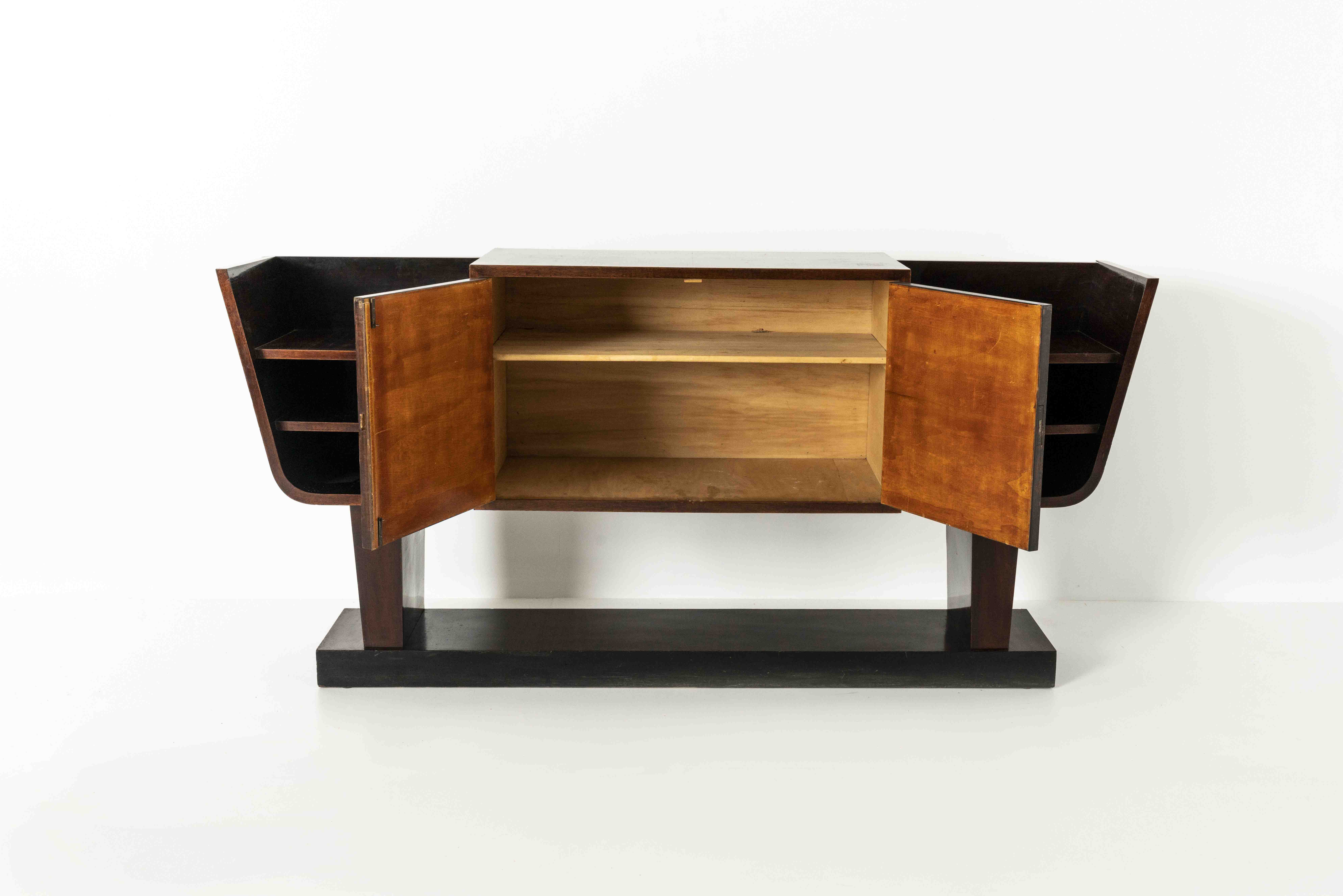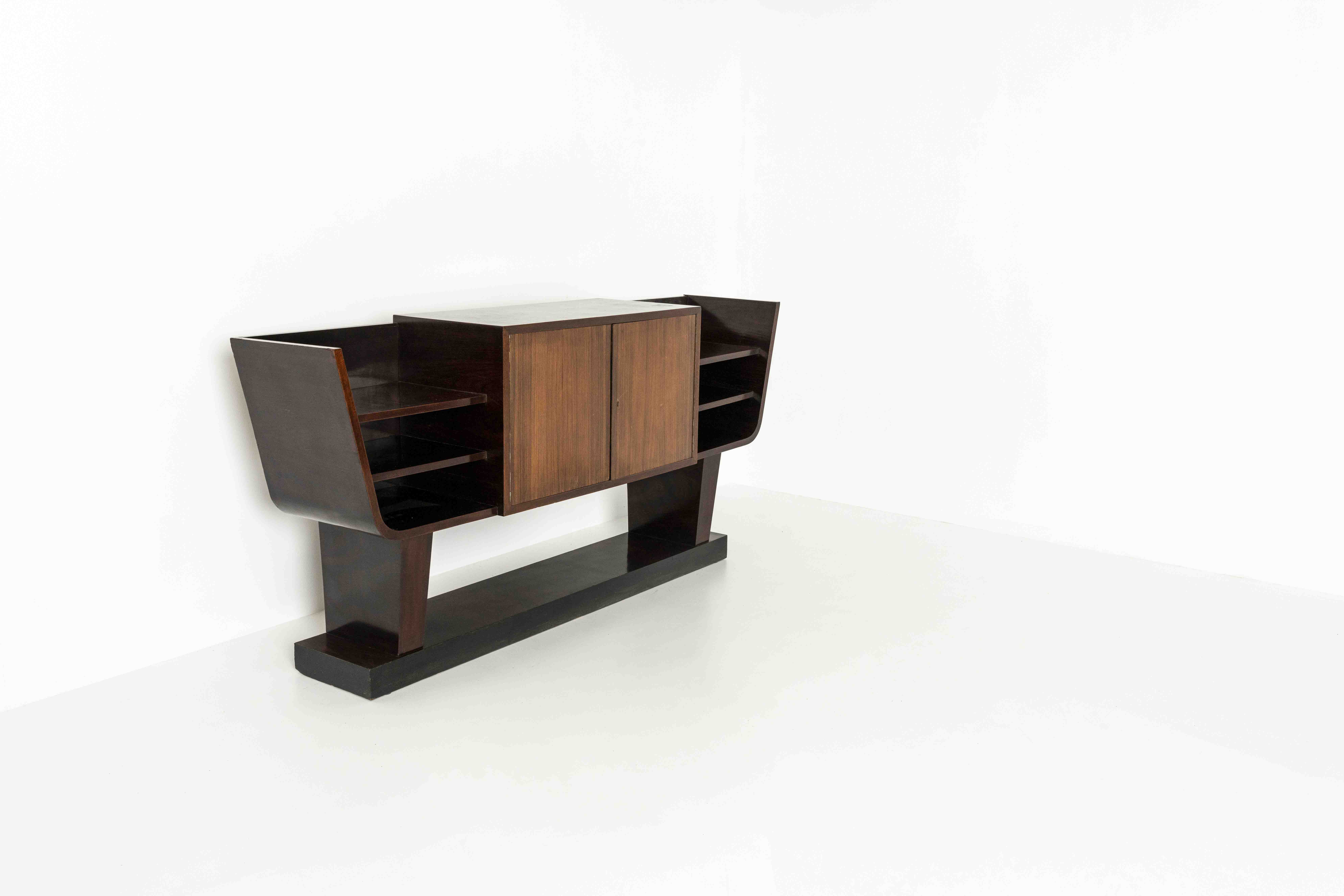 Impressive and large Italian Art Deco Credenza. This unique piece is a mix between a credenza and a console. It features two doors in the middle leading to a shelve that is open on both sides. Highly decorative, yet functional. We especially love the design of the base, although being almost a hundred years old, showing true modernist aspects. This credenza is in good functional vintage condition, however, has some wear and tear due to its age and old woodworm holes.