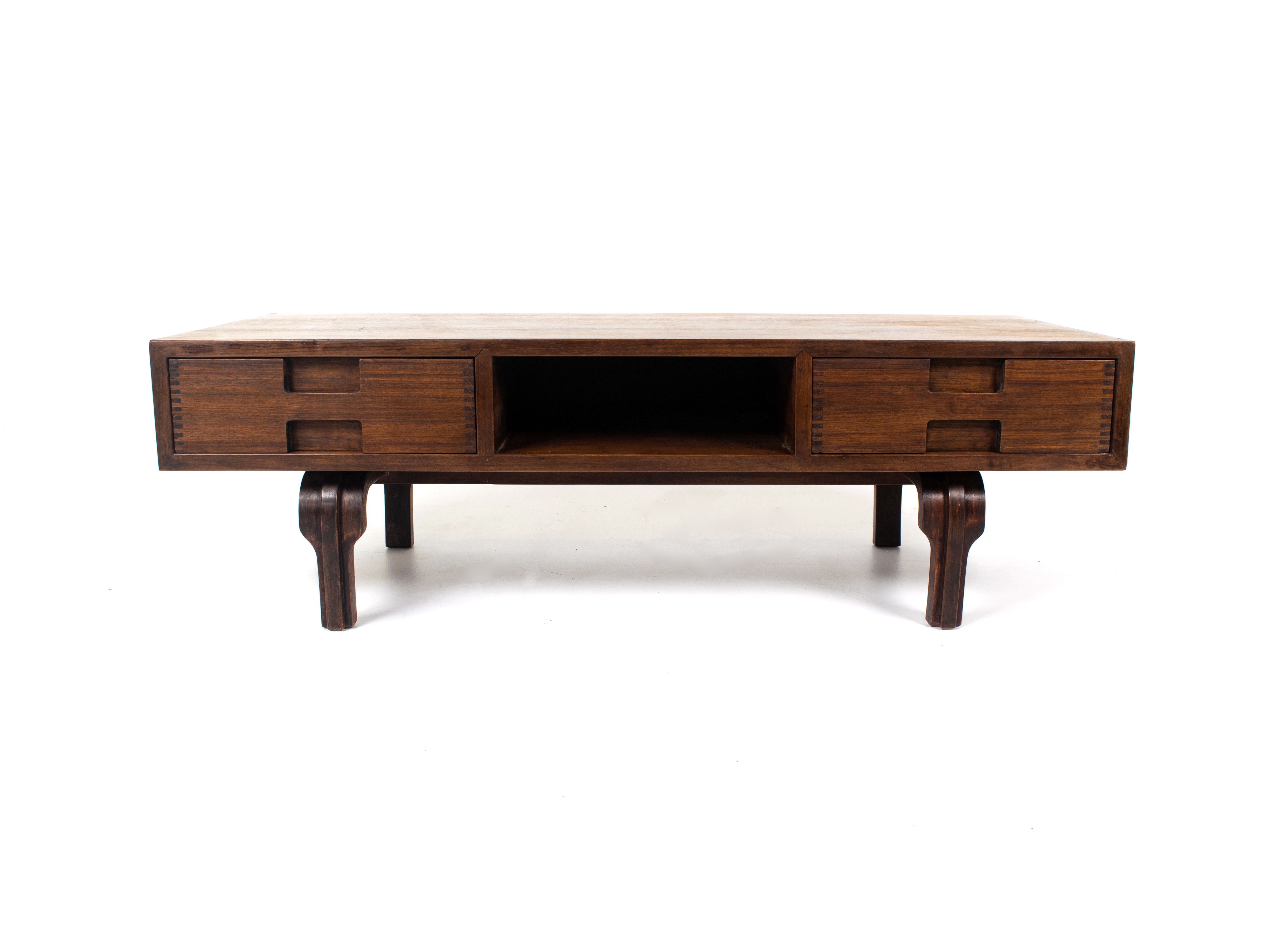 Italian Coffee Table attributed to Gianfranco Frattini, 1960s. This amazing coffee table has a drawer on each side with in the middle a shelve. It has a minimal design, with the feet of the table being the eye-catcher. The four feet have an interesting shape that is very similar to the tables designed by Frattini. The handles are carved within the wood. This piece is in very good condition.