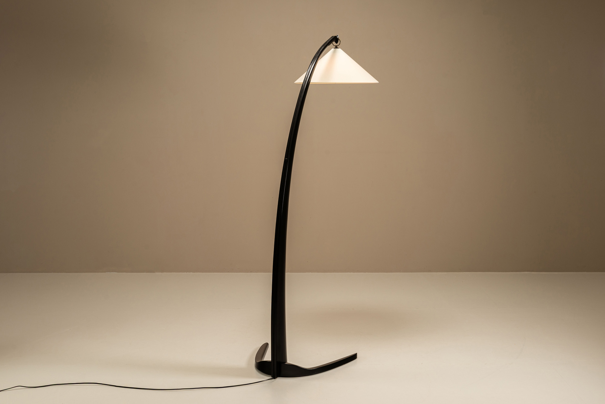 This floor lamp is constructed entirely from lacquered black wood, shaped into a dramatic arch that rises from a forked, claw-like base. The form is both grounded and agile, with a dynamic gesture that seems to defy gravity. From its upper tip, a conical off-white fabric shade is suspended by a metal ring, adding a subtle contrast in material and tone.