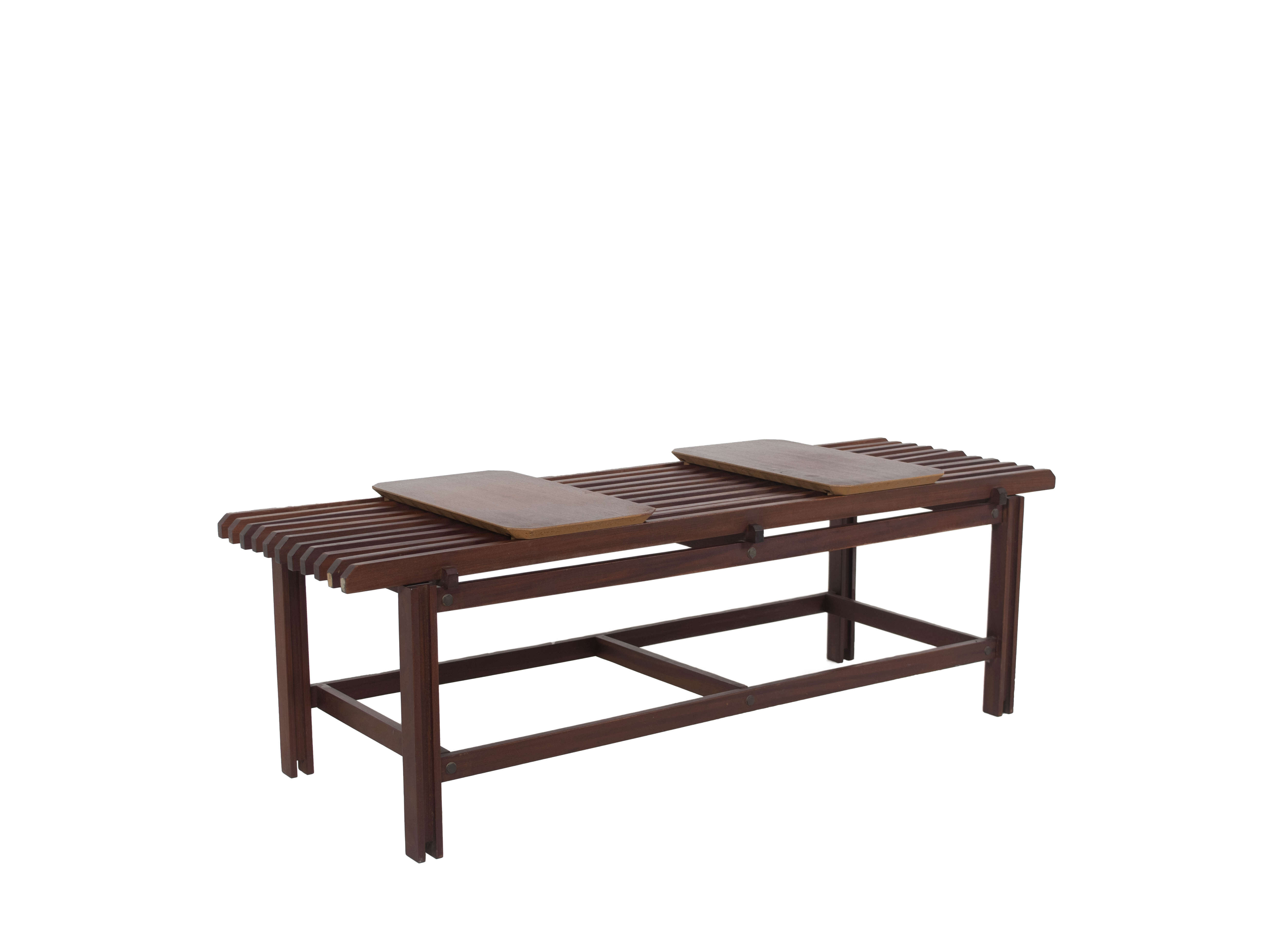 Charming Italian Vintage Slatted Bench with Two Seats from Italy the 1960s. This bench is manufactured in the style of Gianfranco Frattini. Especially the slots in the legs have his characteristics. Unique to this table is the fact that the 'seats' can be moved across the bench. Either as a seating area or as a side table. It makes this bench highly decorative. This bench is in good condition with normal wear and tear due to its age.