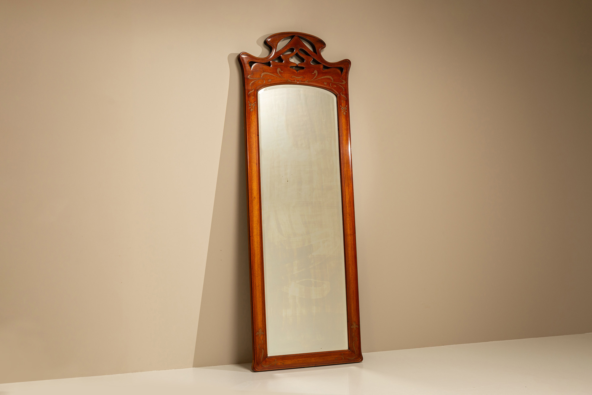 The warmth of solid walnut and the grace of fluid lines come together in this elegant full-length mirror from the Art Nouveau period. Combining decorative craftsmanship with practical scale, it reflects a moment when furniture became a canvas for natural beauty and movement.