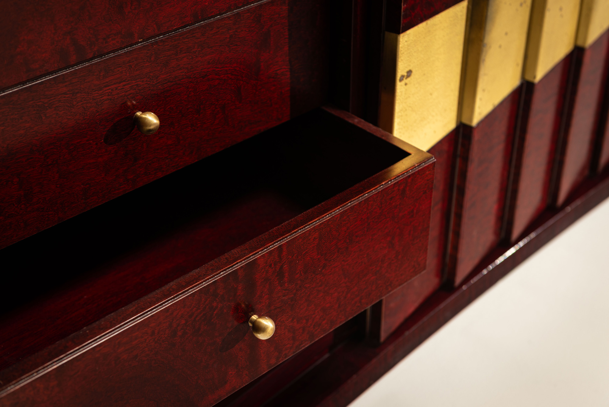 The credenza is in good condition and has been partially restored. The myrtle wood surfaces have been refreshed while preserving the original character. Brass retains its original finish with patination throughout; some minor imperfections are visible, especially on the central panels.