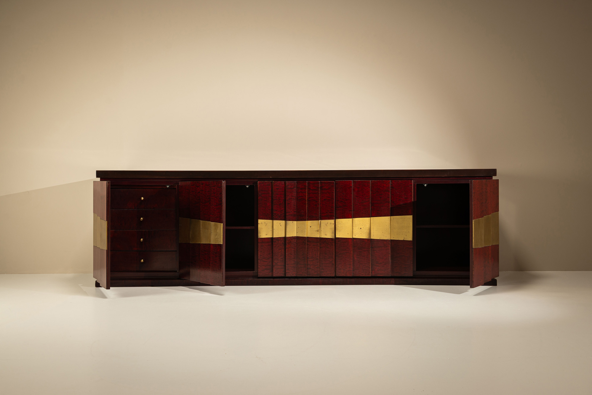 Crafted in Italy during the 1970s, this piece reflects Frigerio’s interest in sculptural forms and surface treatment. The front is composed of individually articulated vertical panels in myrtle wood, each subtly stepped to create a relief-like façade. Across this rhythmic surface, a single band of gilt brass elements stretches in a diagonal sweep, creating a sense of movement and energy. The gold detailing bears small pits and marks, enhancing its tactile quality and suggesting a hand-finished process. The credenza subtly bows forward along its front edge, softening the overall mass and echoing the undulation of the brass band. Inside, practical compartments and drawers are revealed, thoughtfully arranged for storage while preserving the integrity of the sculptural front.