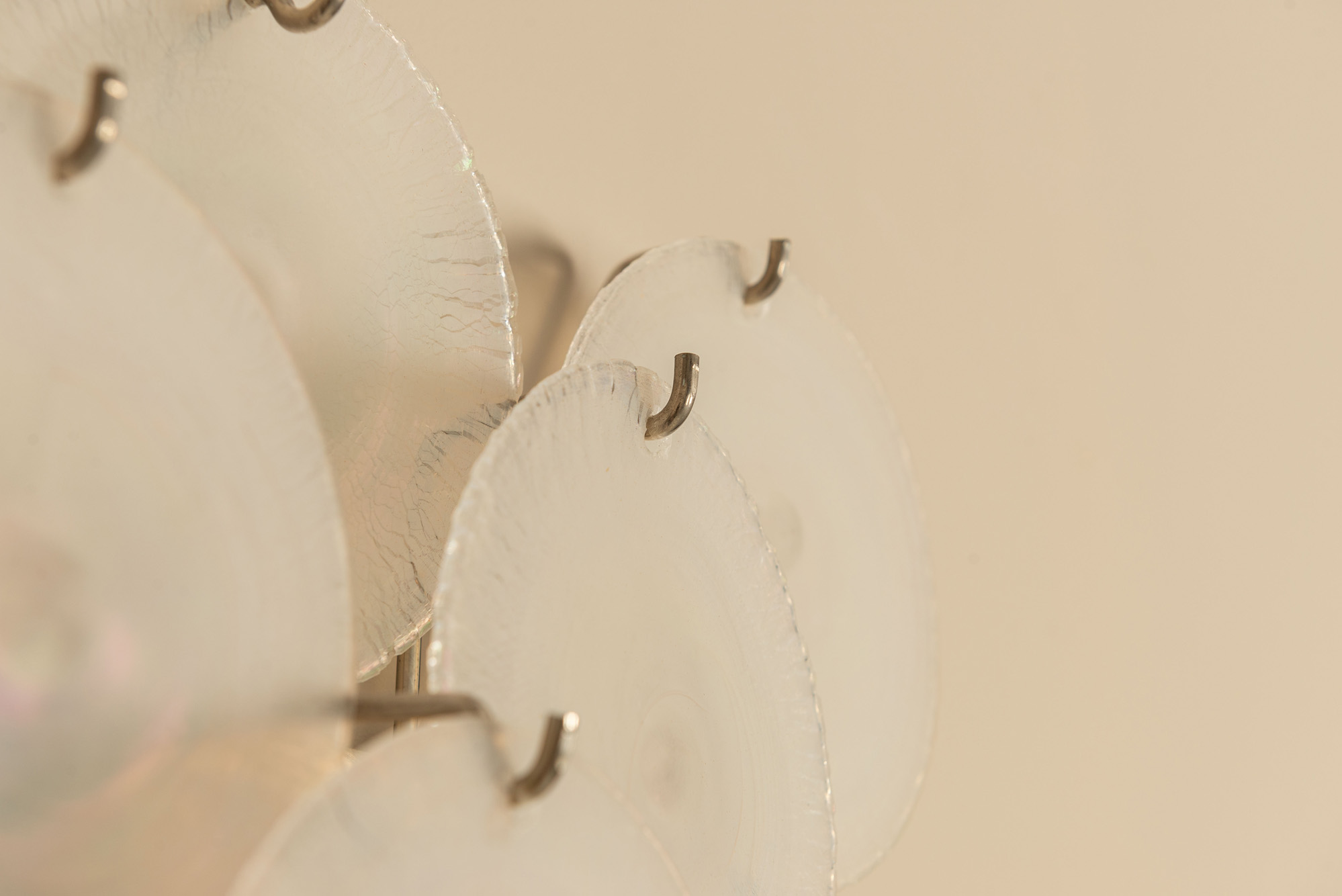 Designed for Mazzega in the early 1970s, each wall light is composed of overlapping Murano glass discs suspended on a metal frame. The discs, slightly convex with a subtle iridescence, are individually mouth-blown and display a gentle opaline sheen that catches and refracts the light when illuminated. The layered configuration creates a rhythmic pattern of soft illumination and shadow.