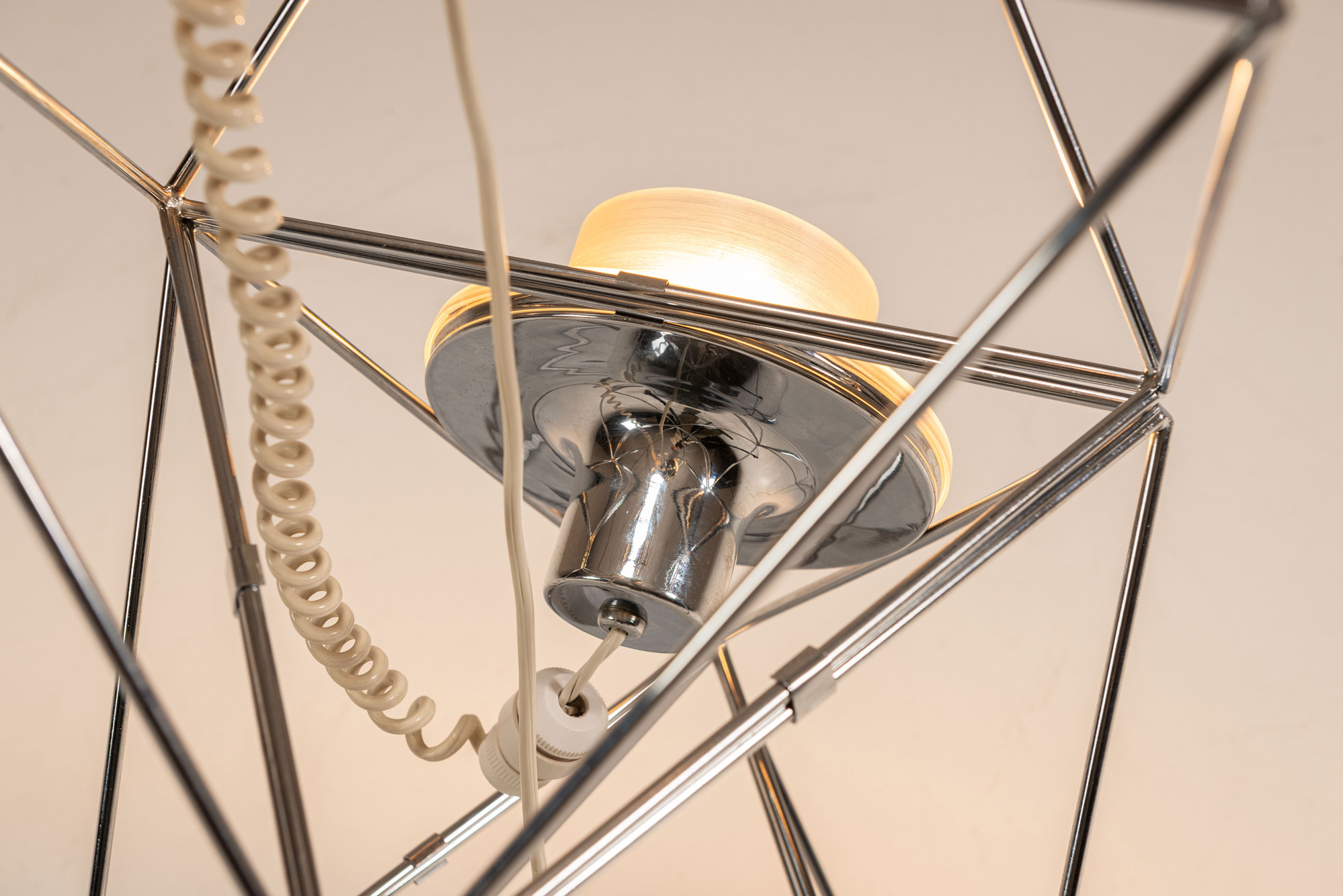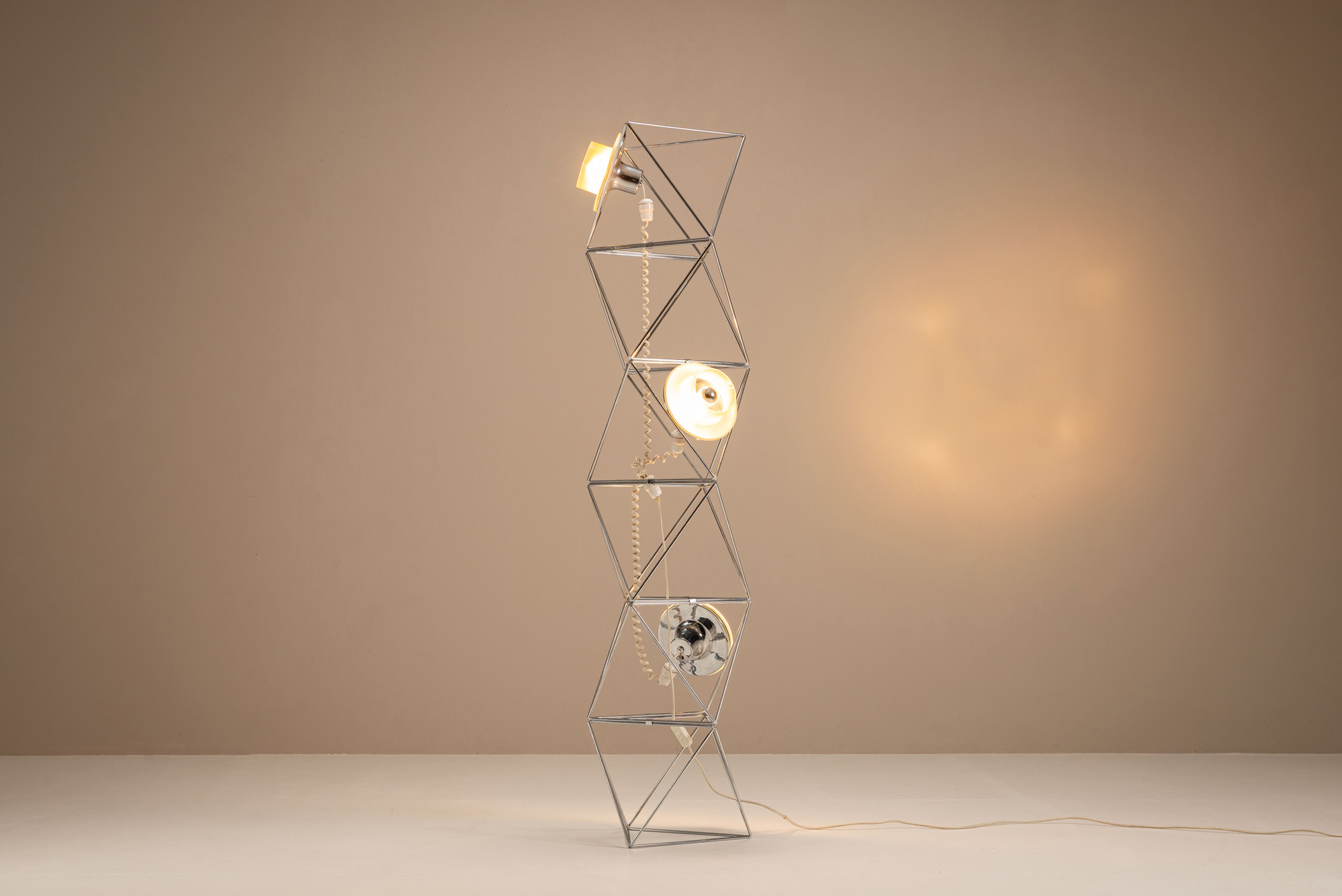 Developed as part of Ragazzo’s Progetto Poliedra, the structure is formed from interlocking polyhedral modules that can be arranged in multiple configurations. Each section, crafted from chromed brass wire, connects through small clips, allowing the piece to be extended, reshaped, or suspended. Within the open geometric framework, three adjustable aluminum light units are fitted with translucent acrylic diffusers and silvered bulbs. These emit a soft, directional glow, accentuating the skeletal rhythm of the frame. The lights are linked by coiled cords to a polished aluminium sphere, visually anchoring the composition while housing the electrical junctions.