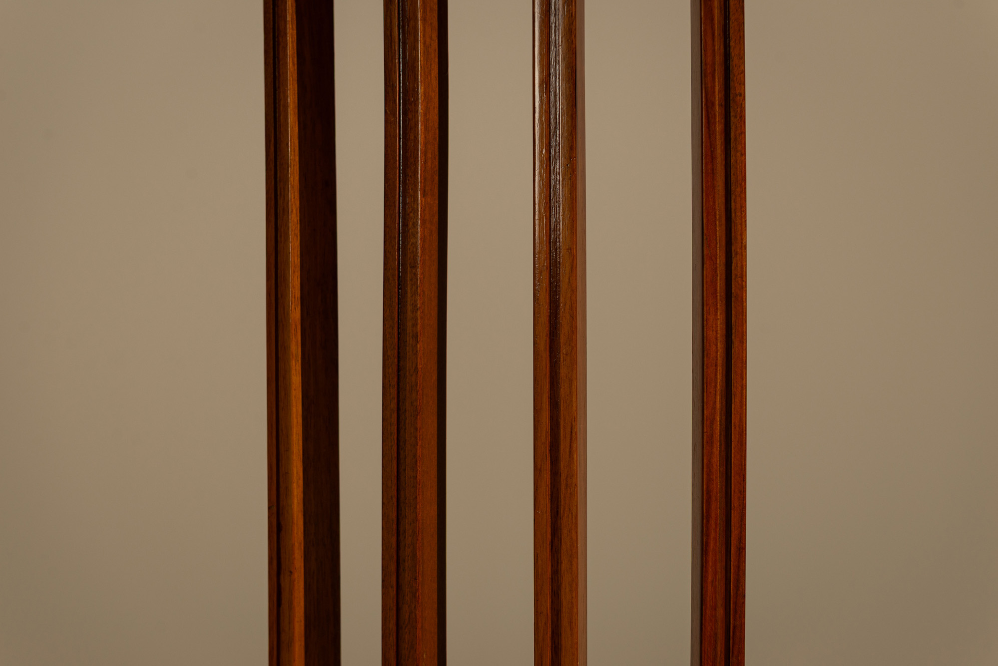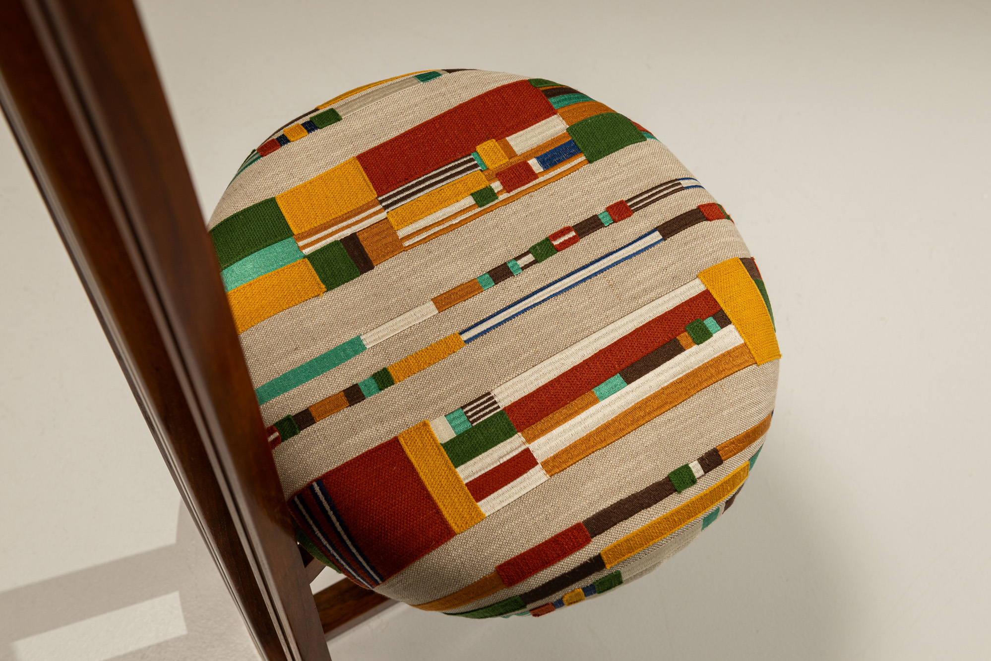 The eight chairs are particularly notable for their soaring backs with curved top rails, channelling the influence of Art Nouveau and recalling the vertical elegance of Charles Rennie Mackintosh. Crafted with repeated vertical slats, they create a sense of enclosure without heaviness, while the sweeping arc of each base adds rhythm and fluidity to the composition. Vibrant new upholstery by Karin Sajo, a French designer known for her bold textile reinterpretations, introduces a contemporary graphic accent to the historical silhouette.