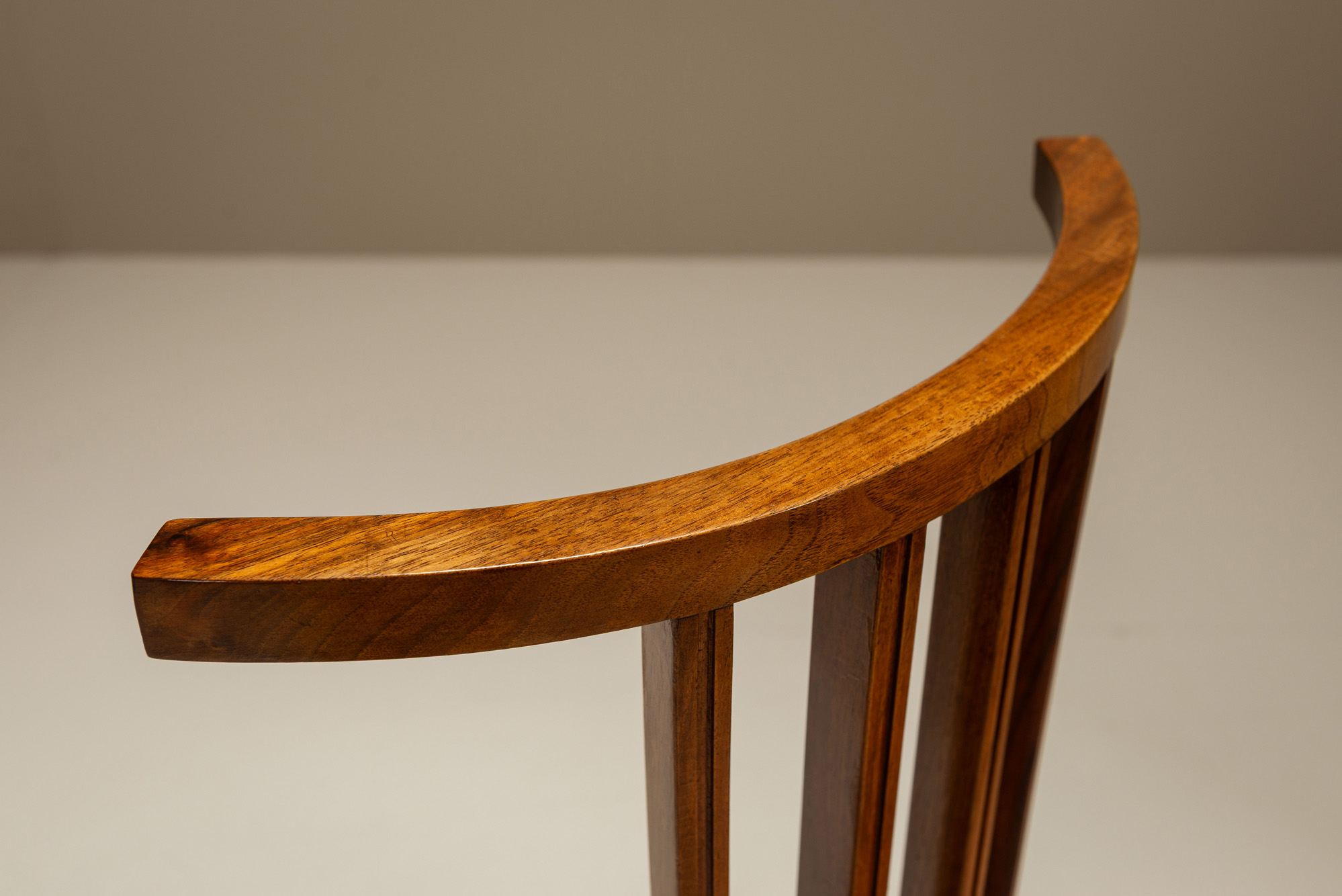 A rare and sculptural set of dining room chairs attributed to the Italian architect Filippo Monti. This set captures the spirit of forward-thinking design in post-war Italy. Executed in richly toned Italian walnut and recently restored, it reflects a harmony between architectural precision and expressive form.