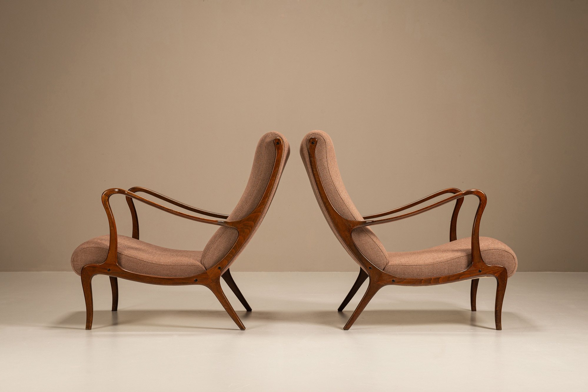 An elegant pairing of form and function, this rare set of ‘Mitzi’ lounge chairs by Ezio Longhi brings the sculptural sensibility of late 1950s Italian design into focus.