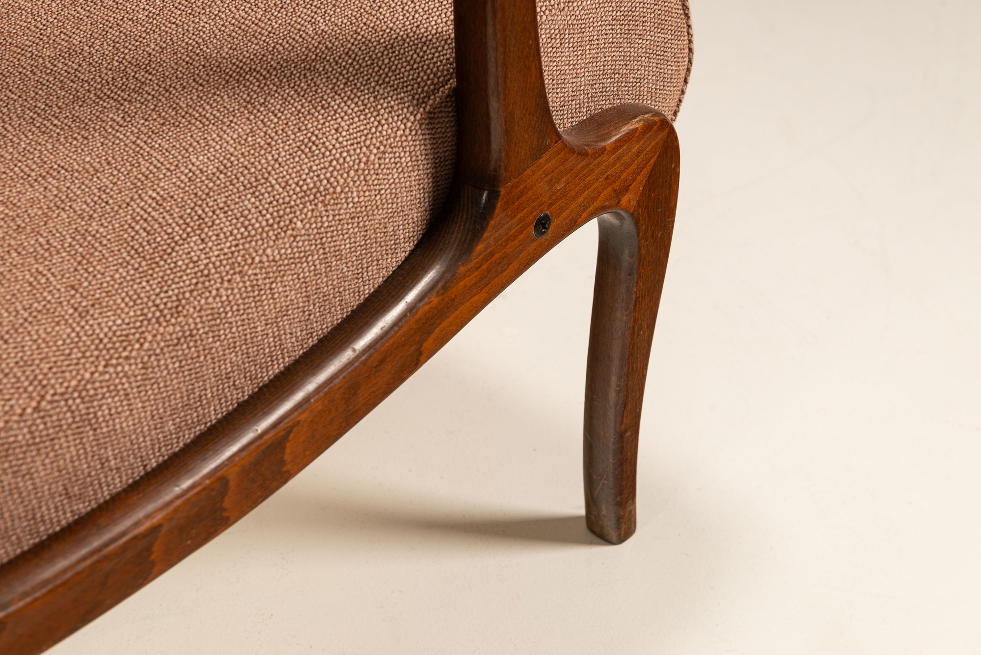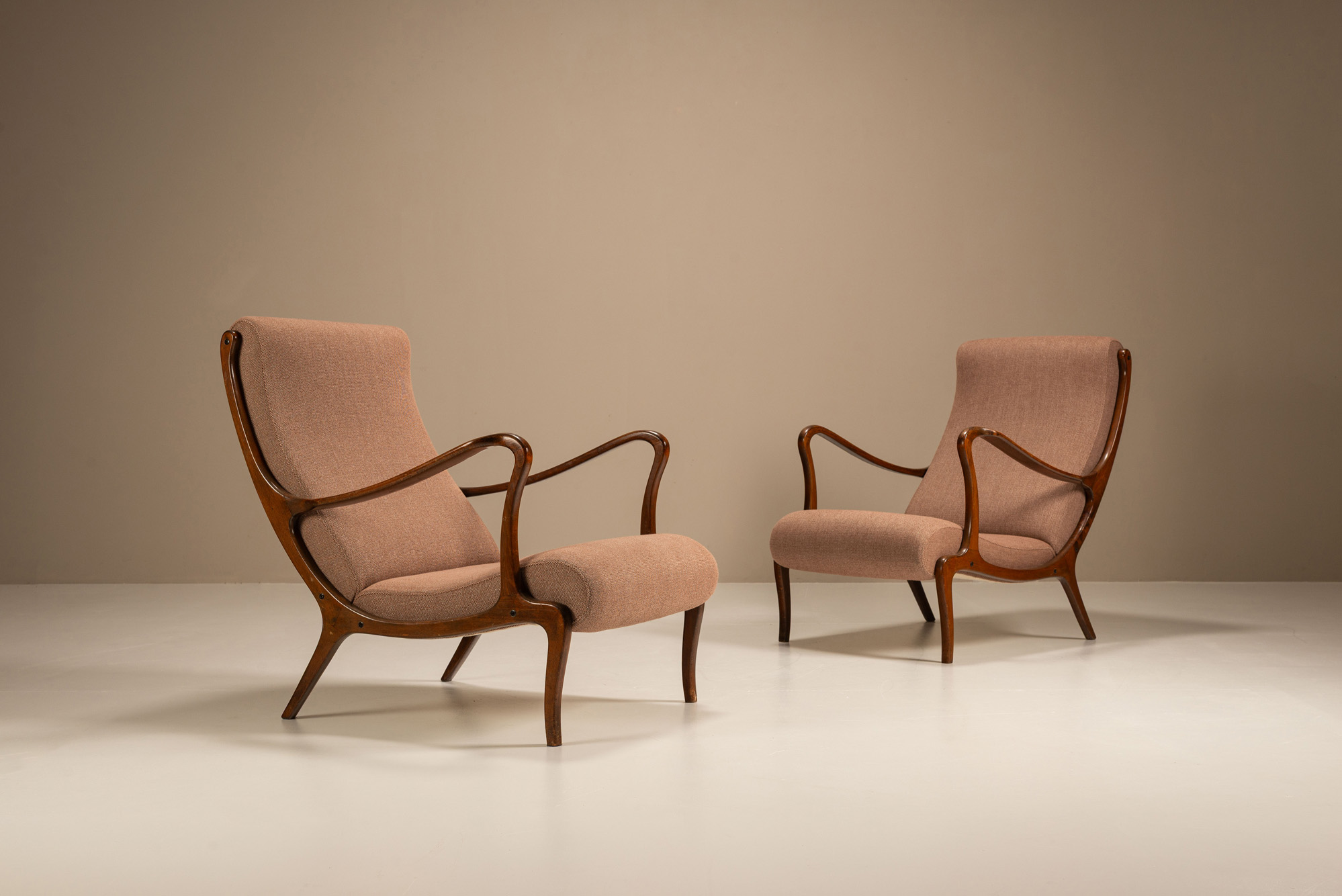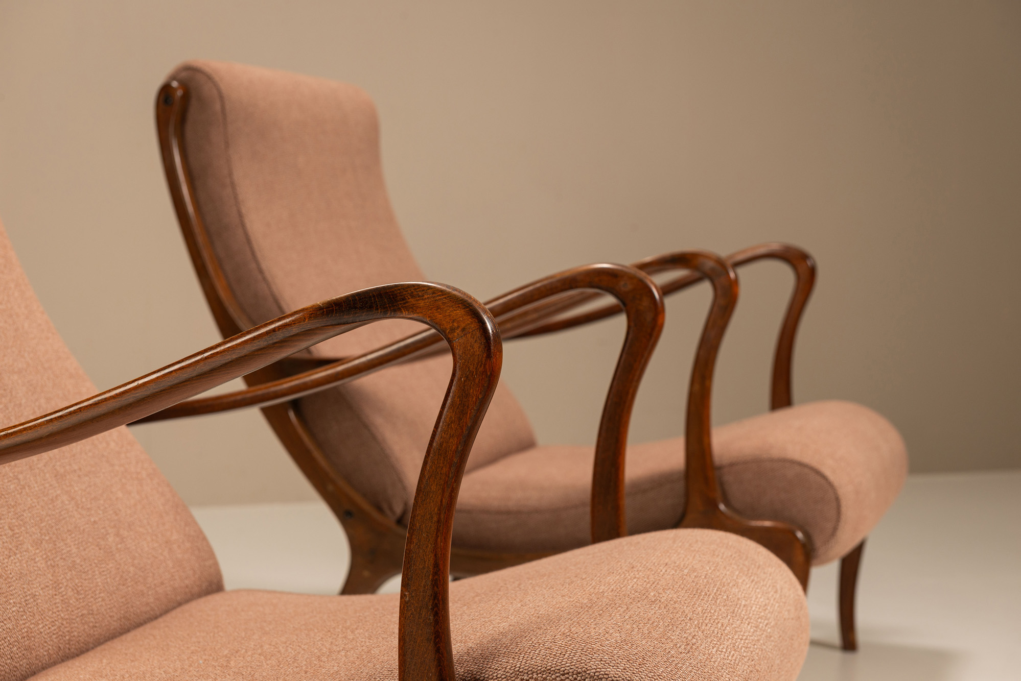 Newly upholstered in a warm rosewood-toned blend, the fabric by DePloeg complements the natural depth of the walnut and enhances the chair’s softly contoured seat and back. The craftsmanship is visible in the jointing, particularly where the arms meet the seat rail and where the wood grain has been oriented to follow the chair’s curvature. The splayed rear legs and slender front stance give the chair an air of lightness, while the generous proportions ensure comfort. This model is occasionally misattributed to Gigi Radice, but recent scholarship and comparison to Elam catalogues point more convincingly to Longhi’s authorship.
