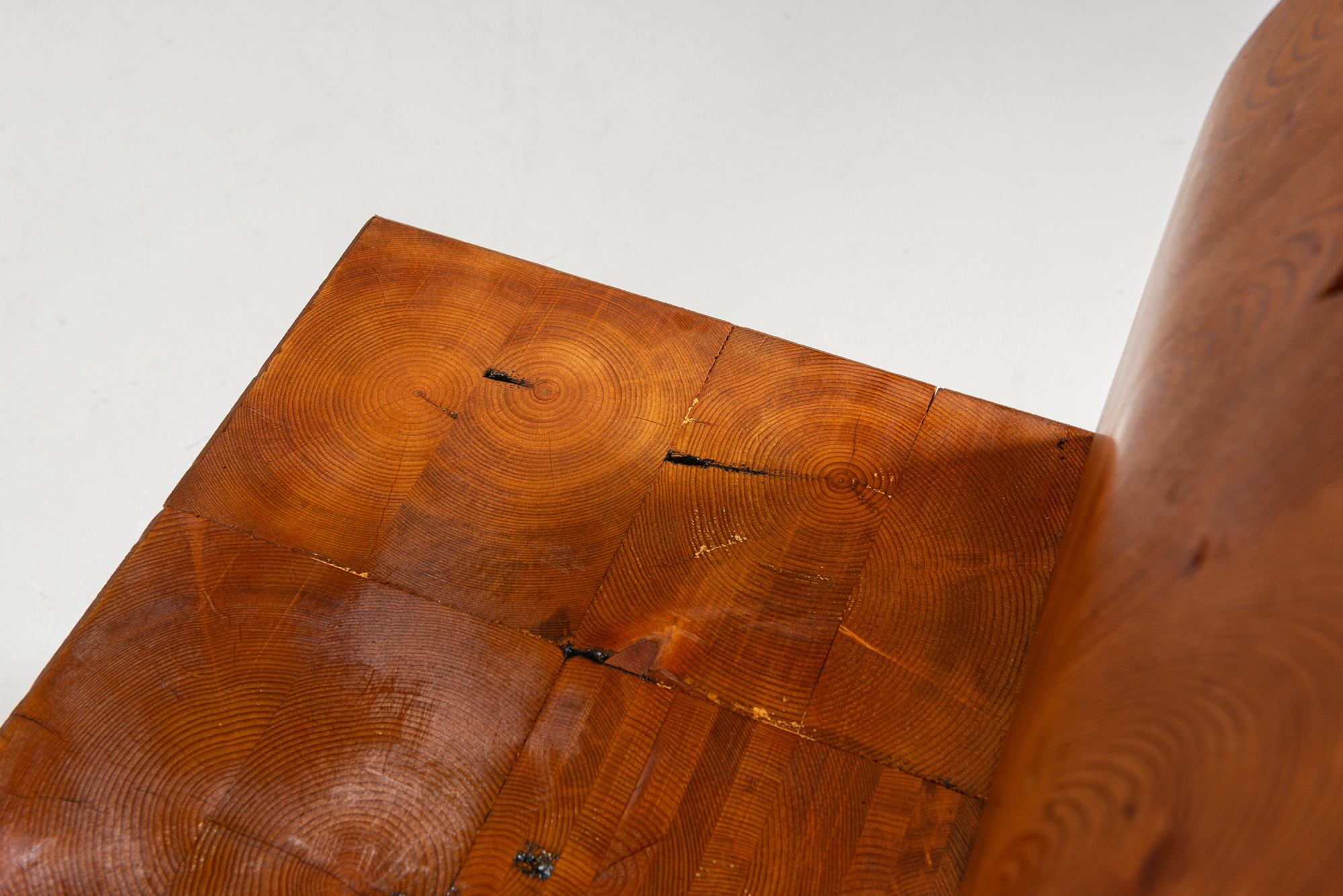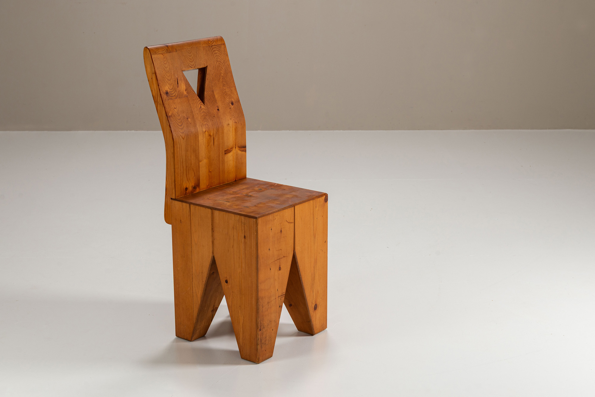 The chairs feature boldly chiselled V-shaped legs, a motif echoed in the precision-cut triangle pierced into each backrest. While heavy and sculptural, their presence is offset by soft natural curves in the back supports, revealing a thoughtful ergonomics behind their rigid appearance. The pinewood is laminated from multiple pieces, showcasing varied and expressive grain patterns. These horizontal and vertical laminations, visible throughout, suggest a workshop-focused production that valued durability and structural cohesion over decorative detailing.