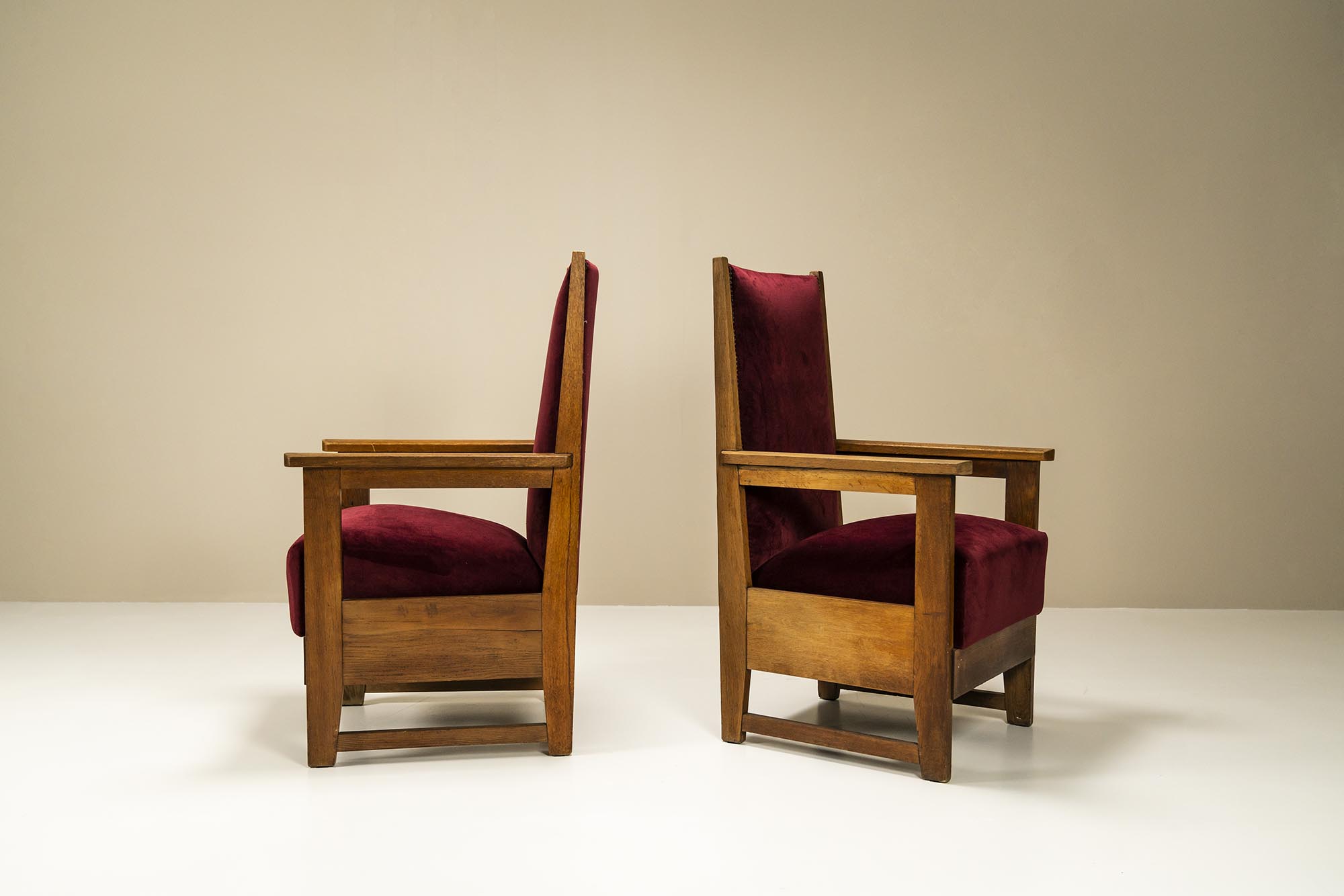 These high-back chairs are the epitome of Amsterdam School style - a perfect blend of functionality and aesthetics. With their beautiful patina and color shades, these chairs exude elegance and sophistication, making them a perfect addition to any modern home. They are very similar to some of the Hendrik Wouda chairs.