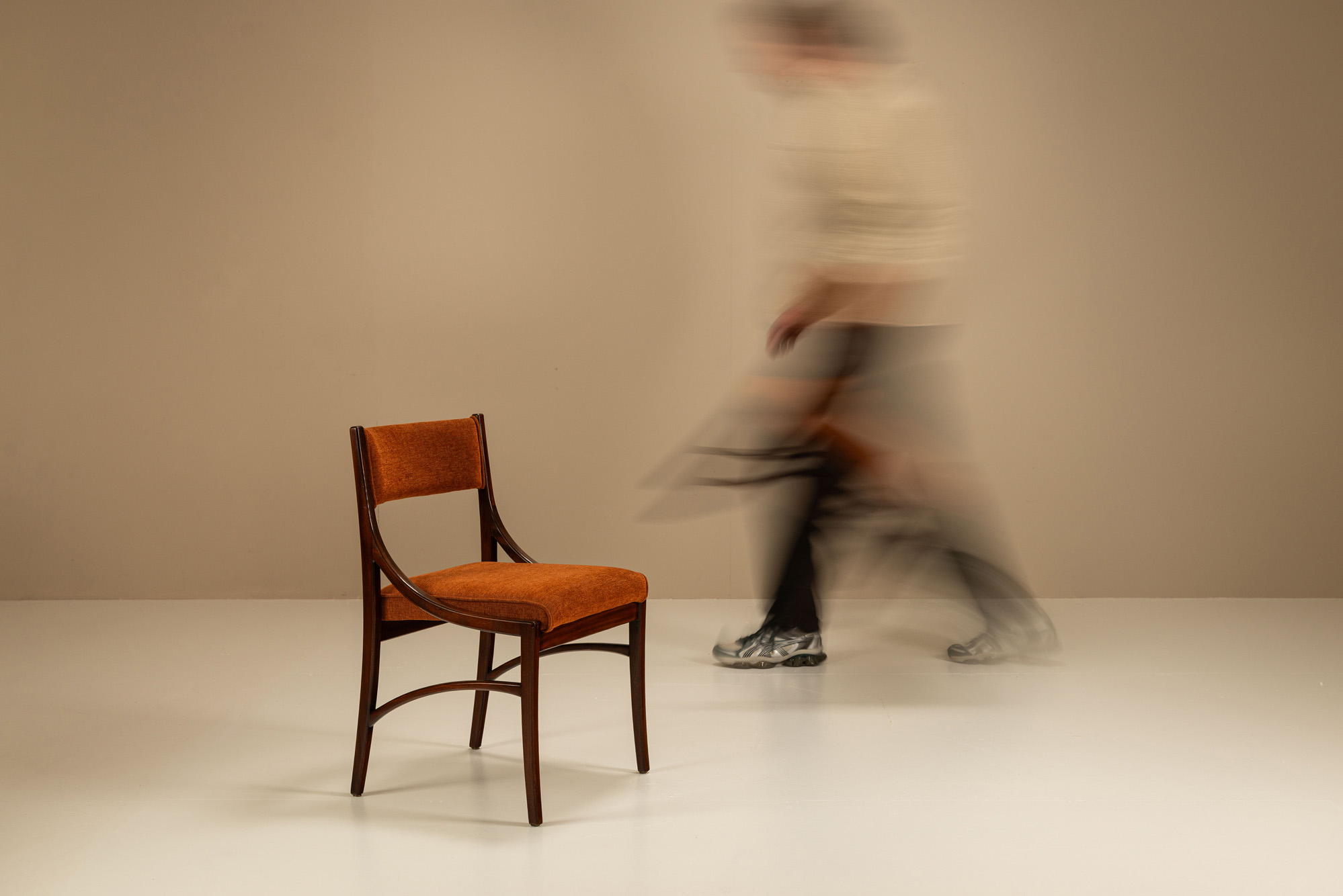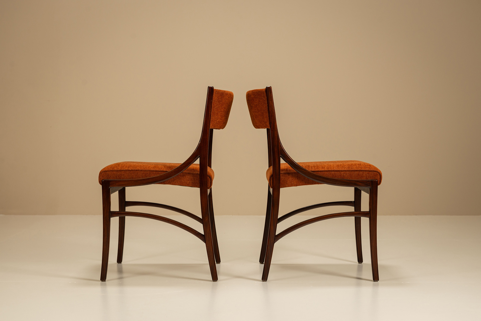 Each chair features a dark-stained solid teak frame, whose sweeping curves and subtle detailing speak to Parisi’s sense of balance and lightness. The sharply defined arc of the front stretcher adds tension to the silhouette, while the sculptural backrest supports create a fluid transition between seat and back. These architectural elements are tempered by comfort: the gently angled backrest and deep seat provide support without compromising the slender profile. The chairs have recently been reupholstered in a burnt orange fabric, which complements the warm tones of the wood and underscores the mid-century Italian aesthetic. Designed during a period when Parisi was refining his modernist language, the Model 110 blends rational construction with a soft, almost lyrical rhythm.