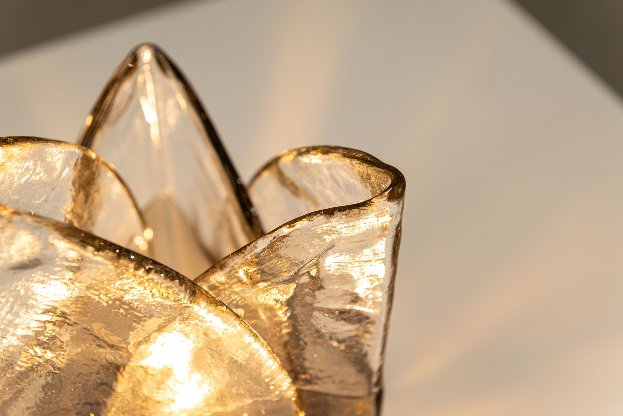 The composition centres on hand-formed Murano glass panels arranged in a rhythmic, almost petal-like structure. Each element rises from a compact brass base, gently patinated and slightly elevated, allowing the glass to appear as if unfolding upward. A single rod anchors the composition, holding the panels with a discreet screw detail that remains visible and honest. The glass shifts in tone from a tobacco hue at the base to a green-tinged transparency above, creating a natural transition where the light source sits. Once illuminated, the surface reveals a textured interior with subtle inclusions, casting warm reflections in amber and soft green. Carlo Nason, working closely with Mazzega during the 1960s and 1970s, often pursued this balance between organic shaping and industrial clarity, favouring modular thinking while allowing the material to retain its expressive quality.