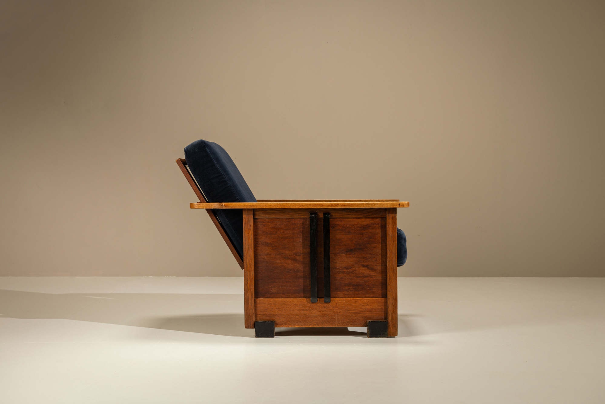 Wear marks along the armrests hint at past use, imparting a slight ruggedness to its polished appearance.A chair that speaks to its authenticity, combining practical design with a hint of aged beauty. This piece would effortlessly complement interiors looking for furniture that blends simplicity with personality.