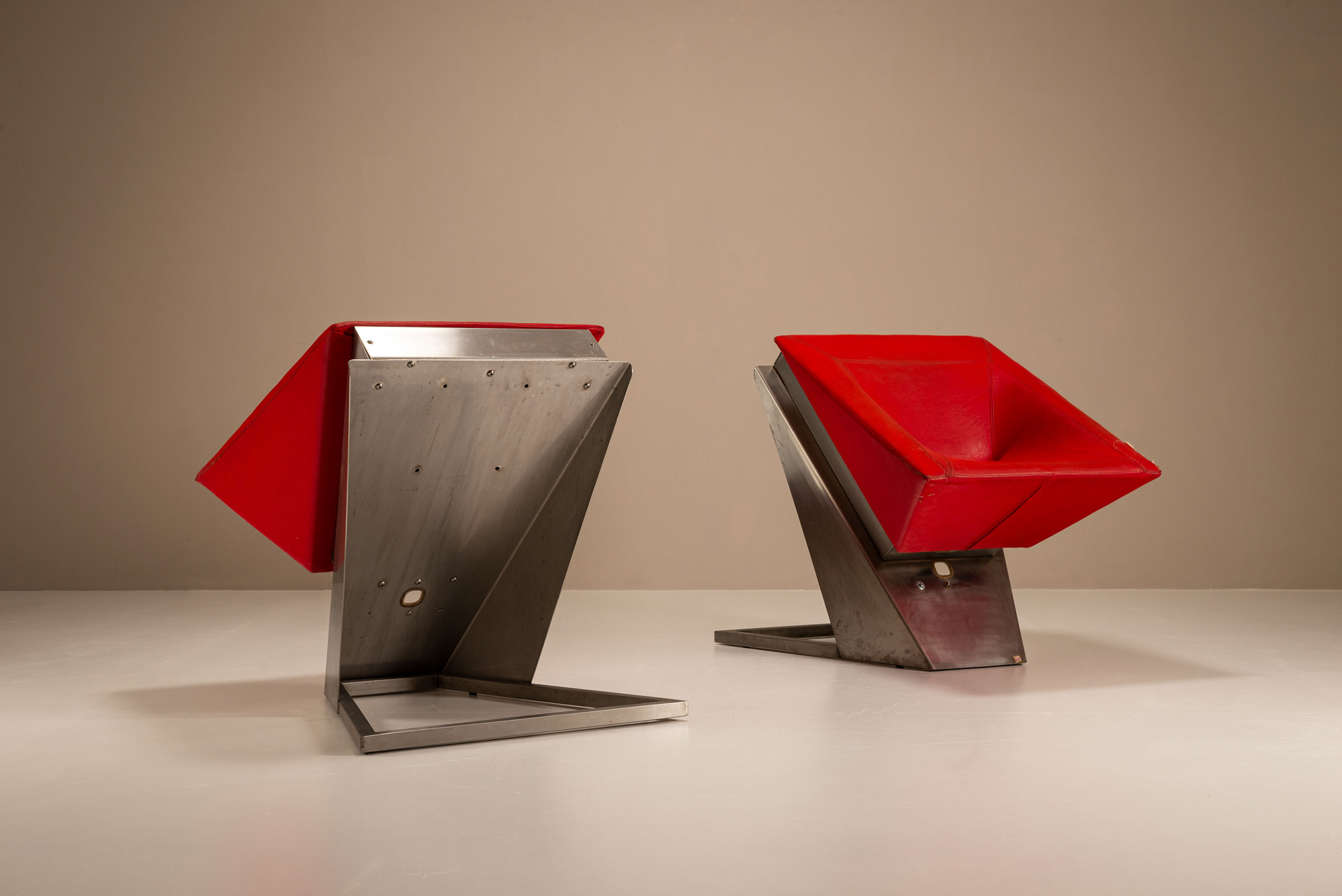 The chairs combine brushed stainless steel with vivid red leather in a geometric construction. Built on sharply angled triangular bases, the design elevates the seat into a dramatic forward-leaning posture, reminiscent of Brutalist architecture and early Space Age aesthetics. The seat itself forms an inverted truncated pyramid; an unexpected shape that cradles the body in a surprisingly ergonomic embrace.