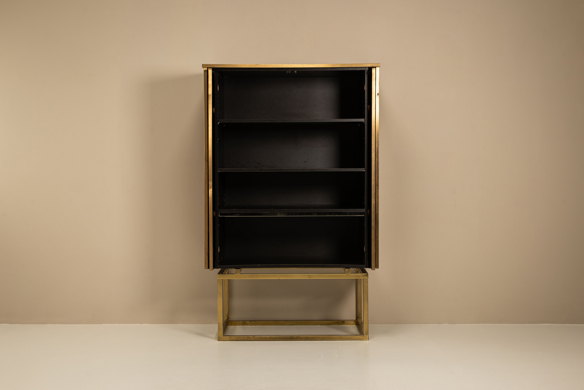 Large Vittorio Dassi Credenza in Wood, Glass and Brass from Italy, ca the 1950s. This is a true eye-catcher. It has five doors with shelves behind it and three original keys available. The top is made of glass with underneath an 'orange' color and signature of two snakes. The legs are made of brass. The size of this credenza makes it very impressive. The credenza is in very good condition given its age, with only small wear and tear.