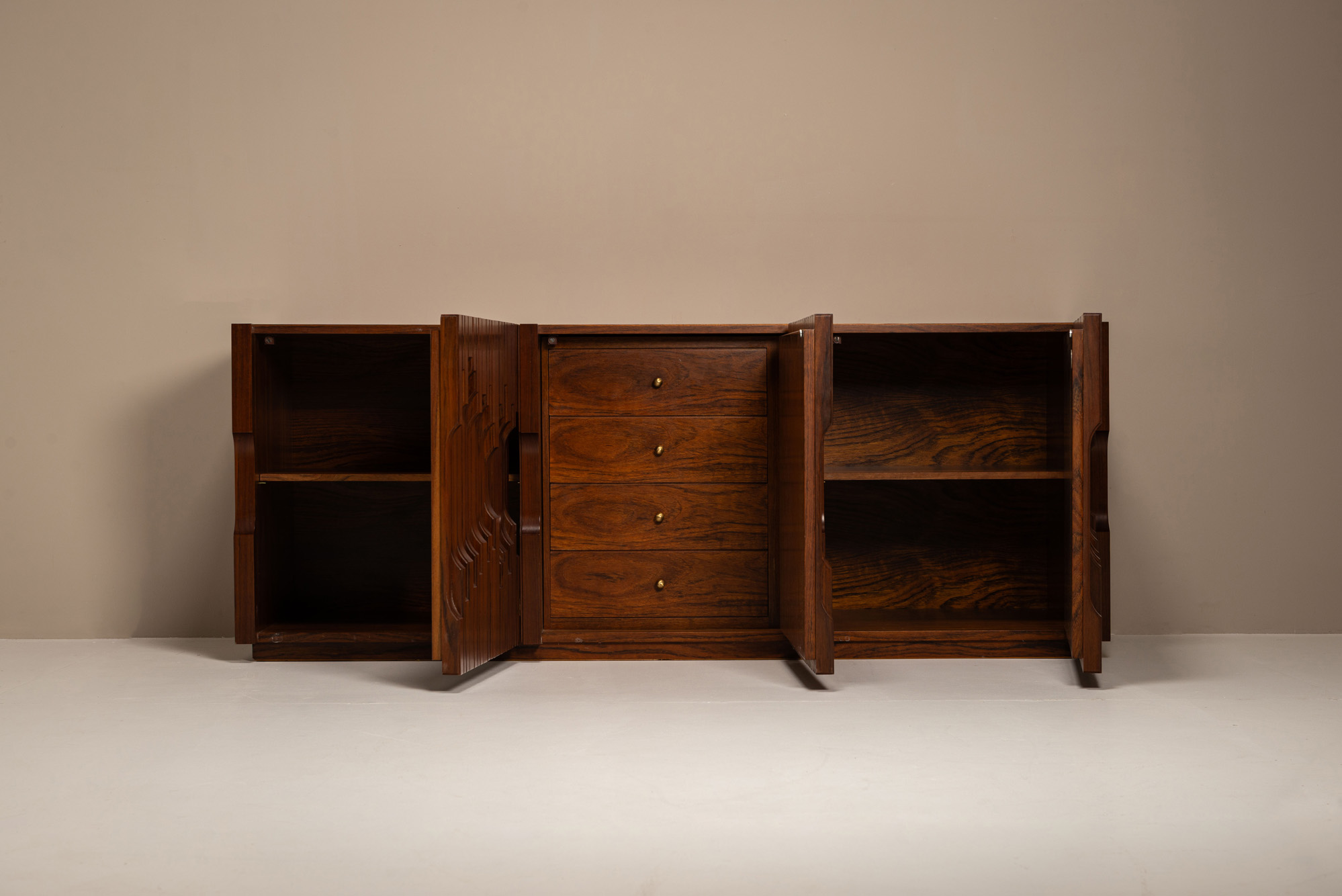 Wall Unit by Ib Kofod-Larsen for Faarup Møbelfabrik in Rosewood from Denmark 1960s. This unit consists of two elements that are not connected; a display cabinet and a cabinet with two drawers. The display cabinet has two doors with glass and black metal handles. On the inside ther are four shelves. The drawers of the base unit has the same style black metal handles. The set is in good condition with normal wear and tear due to its age. Clearly marked with a sticker on the back.